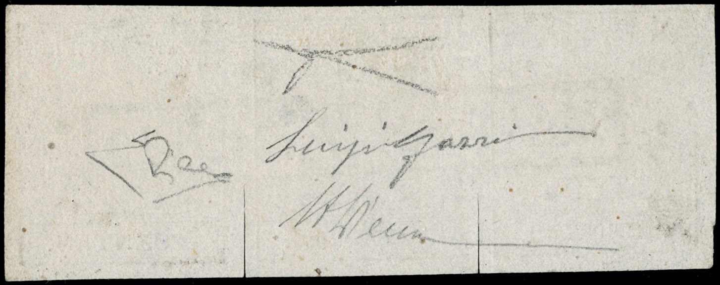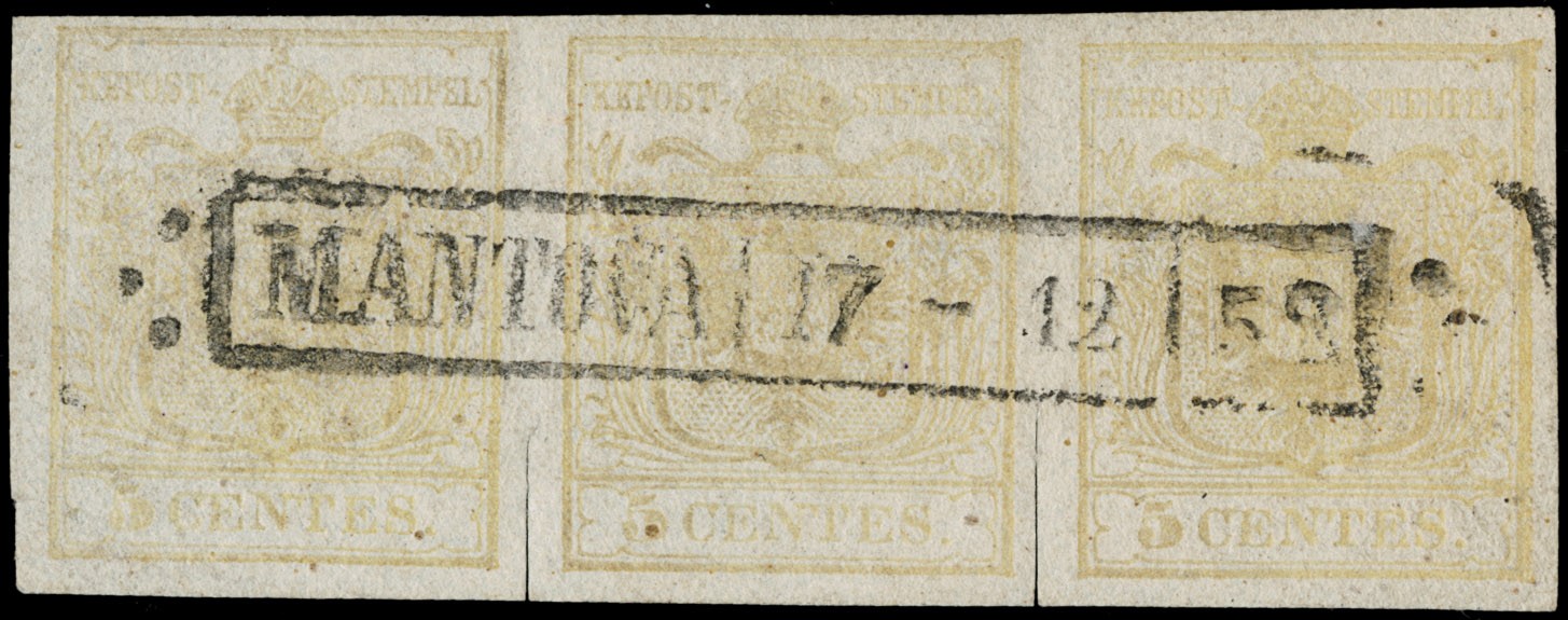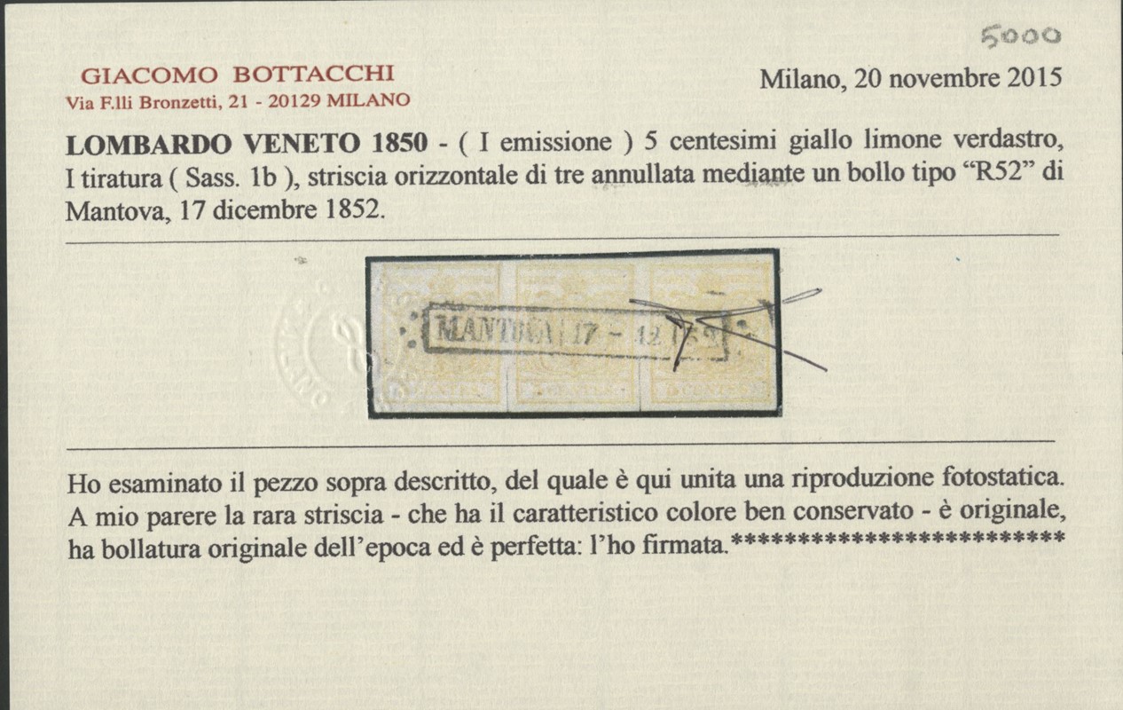 1850 - 5c giallo limone verdastro I tir., colore particolarmente chiaro, striscia orizzontale di tre usata a 'MANTOVA 17 - 12 | 52'. Rarissimo multiplo di questa rara tinta. Firme A.Diena, E.Diena, Luigi Gazzi e CF Bottacchi (Sassone 1b - Euro 46.000)