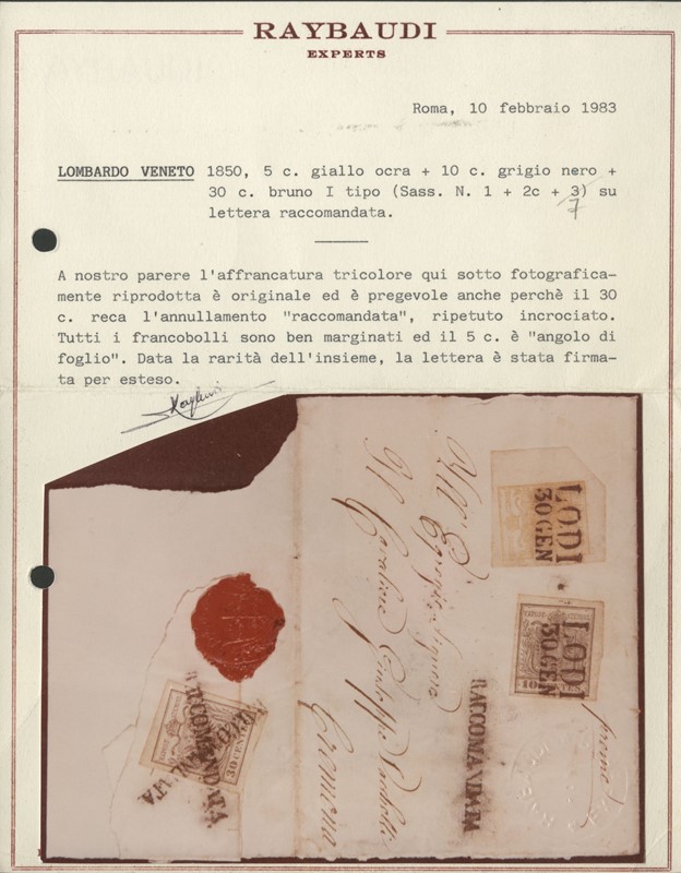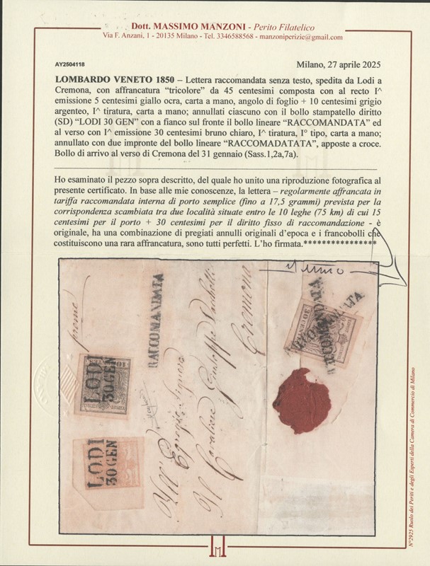 1850 - 5c giallo ocra AdF, 10c grigio argenteo I tir. e 30c bruno chiaro I tipo I tir., su 'RACCOMANDATA' da 'LODI 30 GEN' a Cremona. Lettera priva delle sguardiole laterali. CF Manzoni e Raybaudi (Sassone 1+2a+7a+pt.9 - Euro 10.350++)