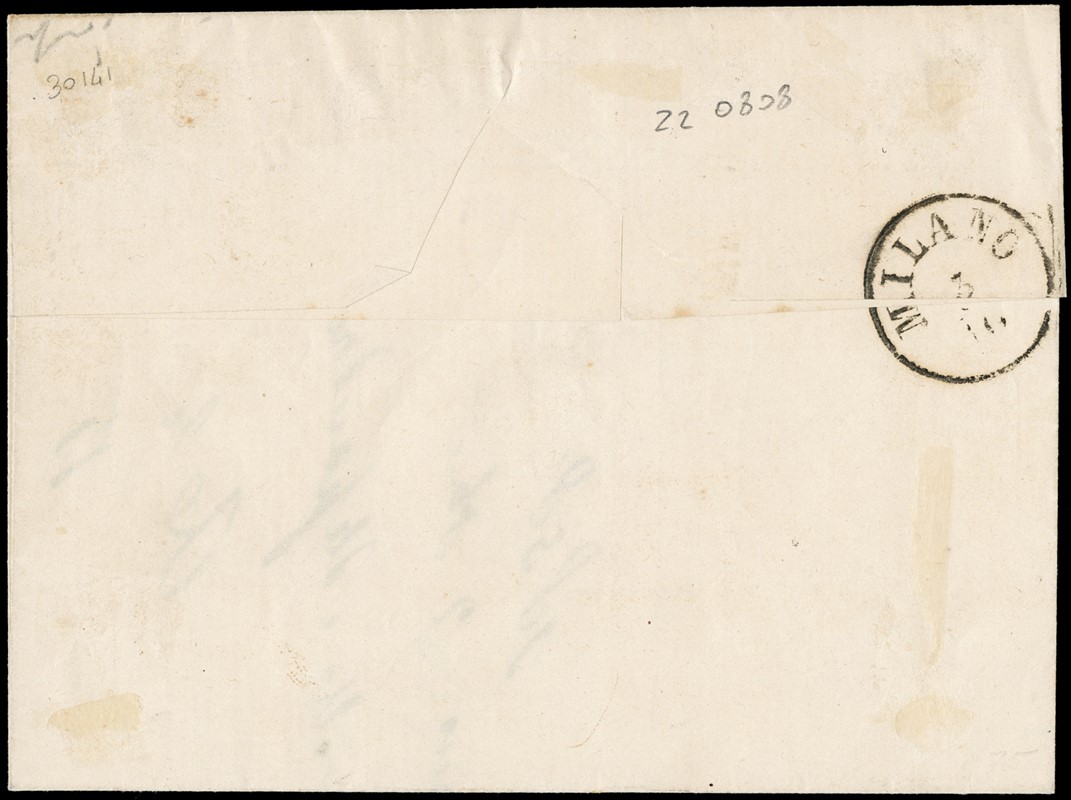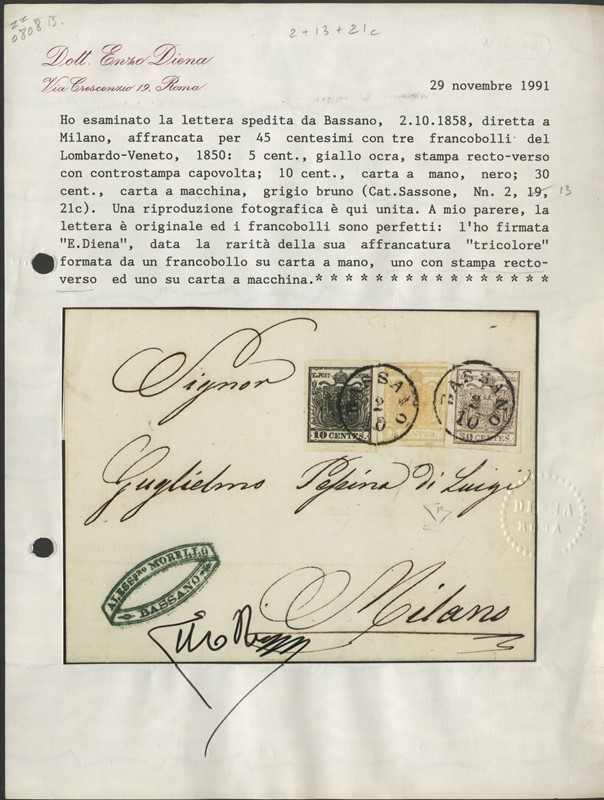 1850 - 5c giallo ocra con stampa recto verso capovolta, 10c nero carbone e 30c grigio bruno (stampa povera) carta a macchina, da 'BASSANO 2/10' 1858 a Milano. Splendida e rara tricolore. CF E.Diena (Sassone 2e+13+21c - Euro 28.500+)
