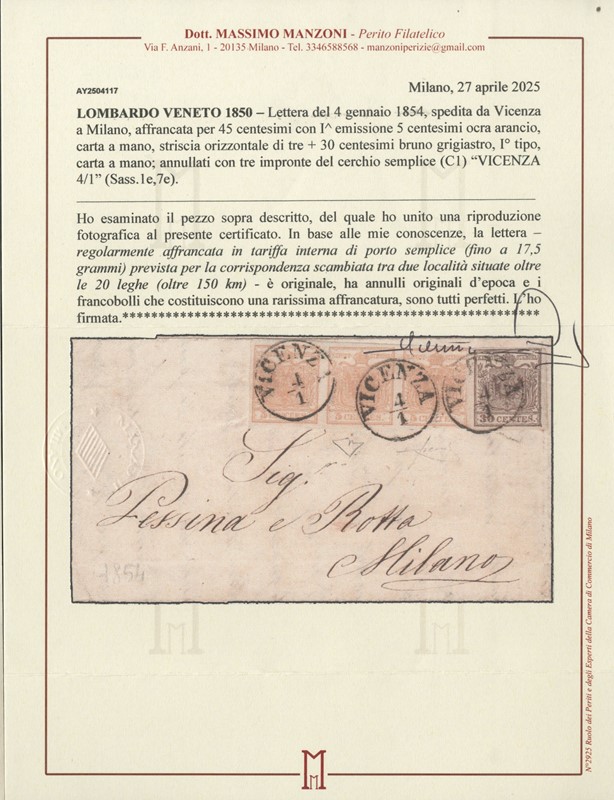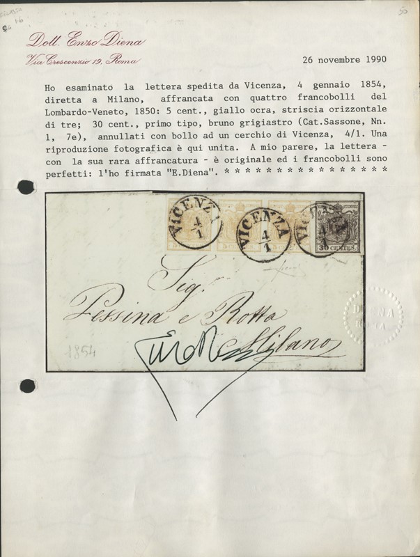 1850 - 5c ocra arancio, ST3, e 30c bruno grigiastro I tipo da 'VICENZA 4/1' 1854 a Milano. Firma Fiecchi, CF Manzoni ed E.Diena (Sassone 1e+7e - Euro 54.325)