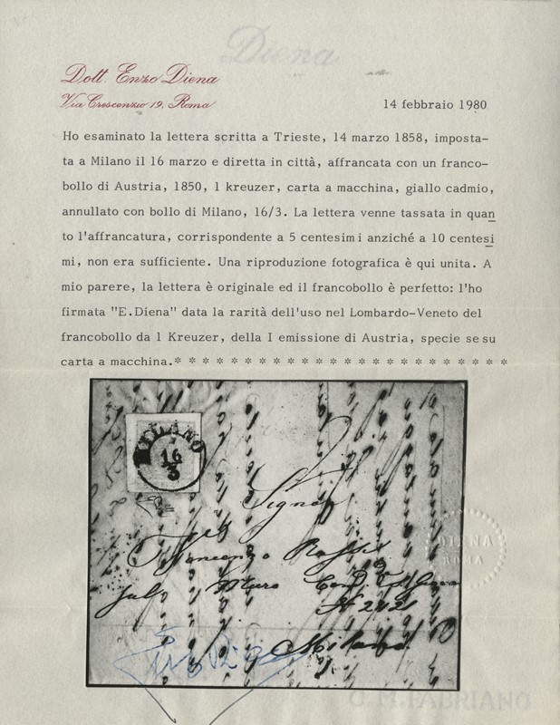 1850 - Austria 1kr giallo cadmio, carta a macchina su lettera scritta a Trieste, forwarded a 'MILANO 16/3' (C1) per citta', tassata per insufficiente affrancatura. Combinazione rarissima e splendida. CF E.Diena (Unificato 1 / Sassone - Euro 25.000+)