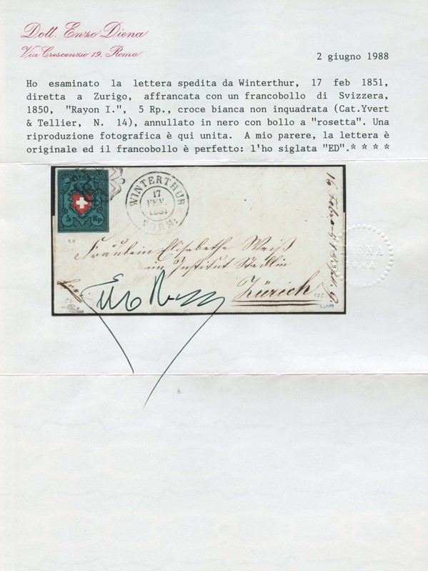 1850 - Poste Federali, 5rp blu scuro, nero e rosso, da 'WINTERTHUR 17 FEV 1851' per Zurigo. CF E.Diena (Zumstein 15II - CHF 1.500)