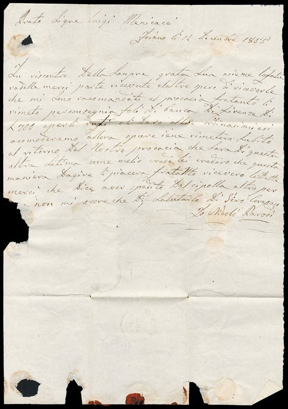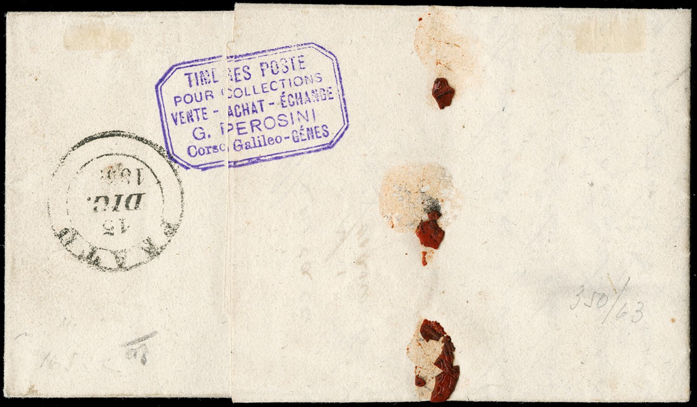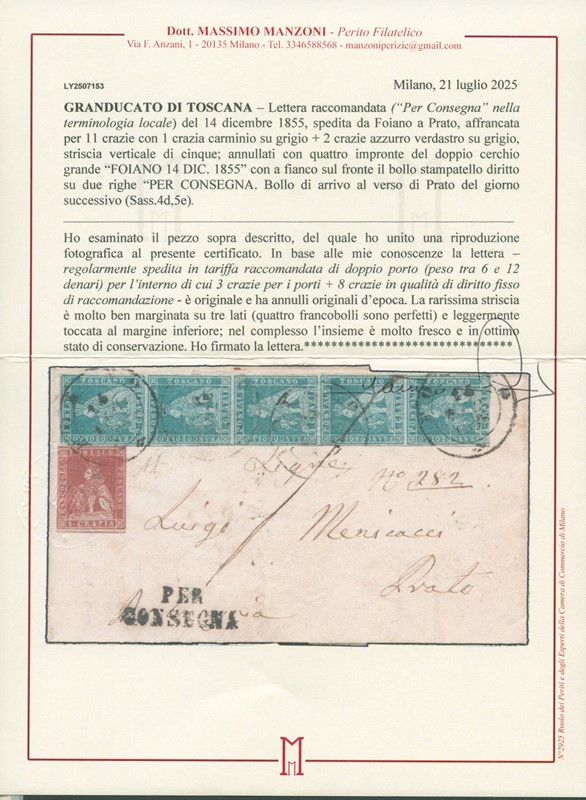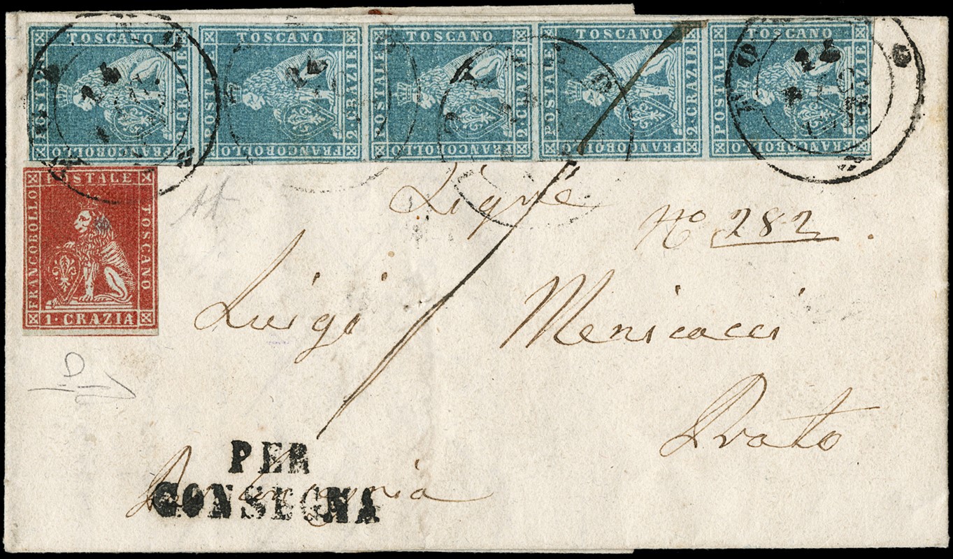 1851 - 1cr carminio chiaro su carta grigia e 2cr azzurro verdastro su carta grigia, ST5 verticale (appena stretta in basso), su lettera 'PER CONSEGNA' da 'FOIANO 14 DIC 1855' a Prato. Rarita' in ottime condizioni. Sigla A.Diena, CF Manzoni (Sassone 5e - Euro 88.000+)
