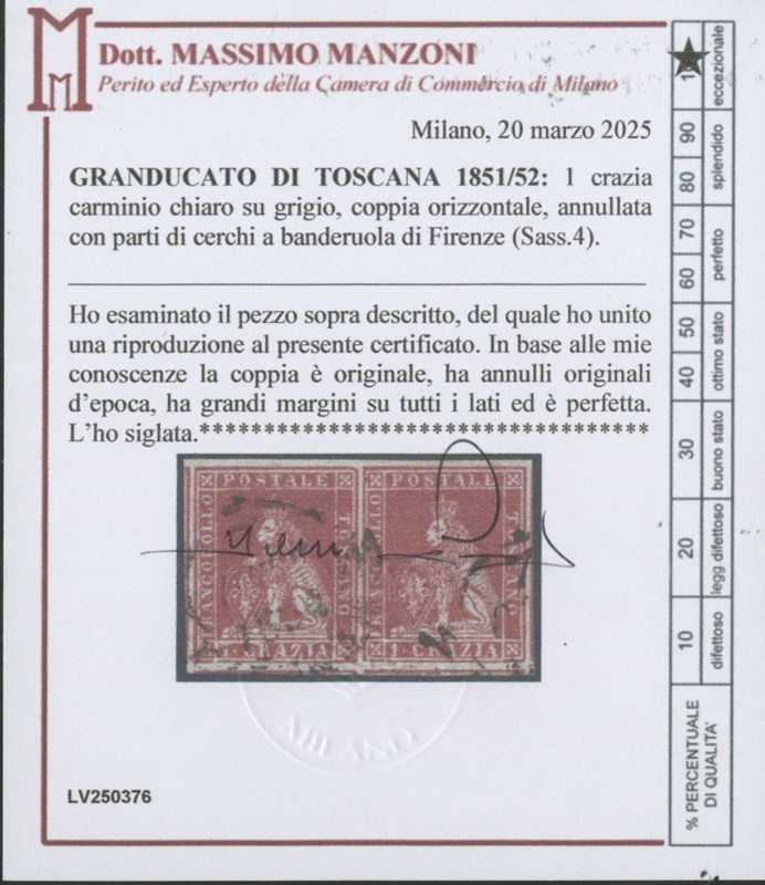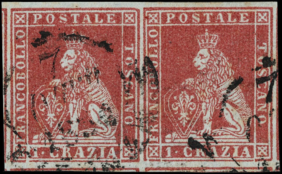 1851 - 1cr carminio chiaro su grigio, coppia con ampi margini bianchi e parti degli esemplari adiacenti, annullata con cerchio a bandieruola di Firenze. CF Manzoni (Sassone 4 - Euro 575)