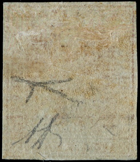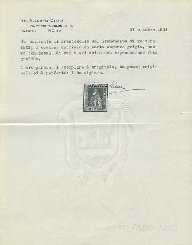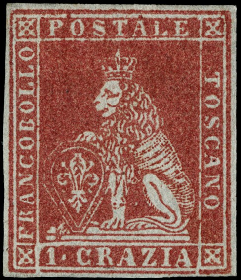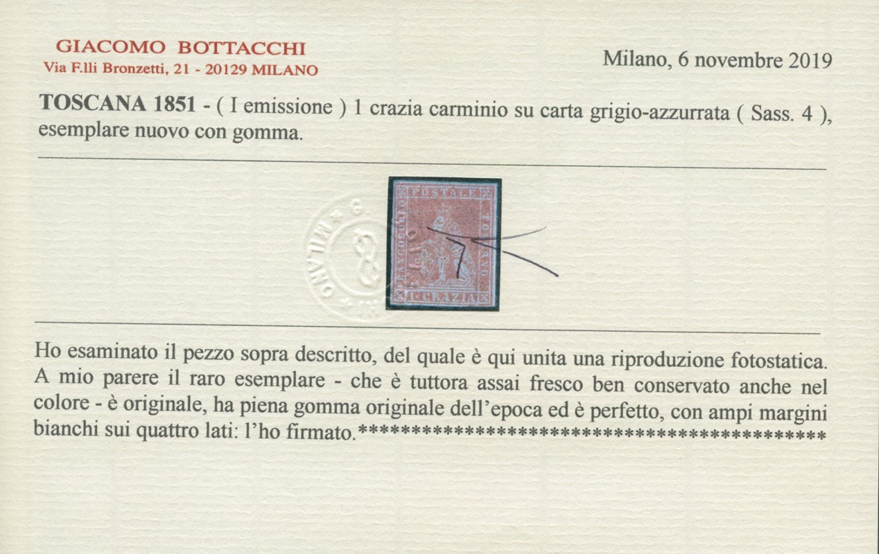 1851 - 1cr carminio su carta grigio azzurra, nuovo con piena gomma e molto ben marginato. CF A.Diena e Bottacchi (Sassone 4 - Euro 20.000)