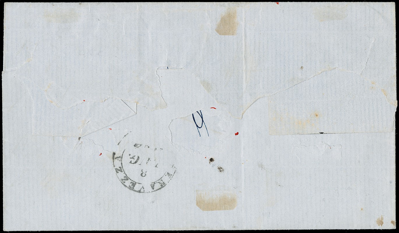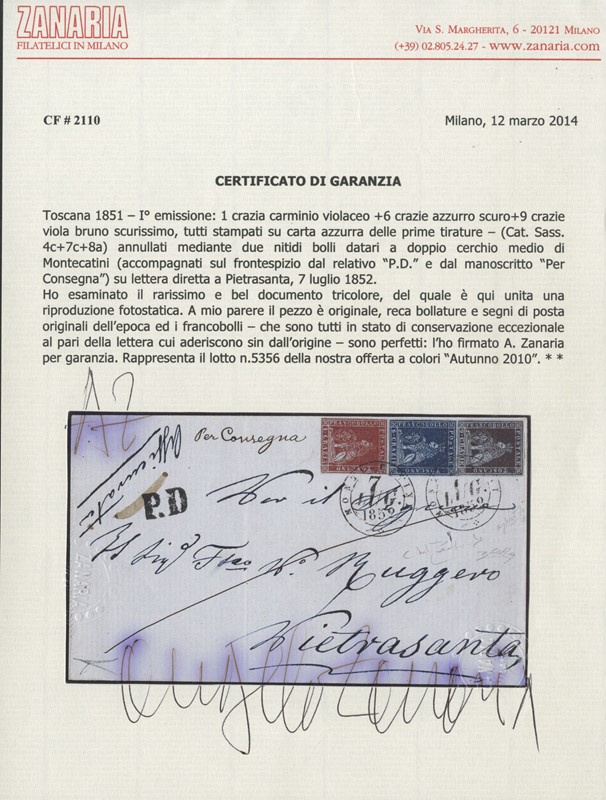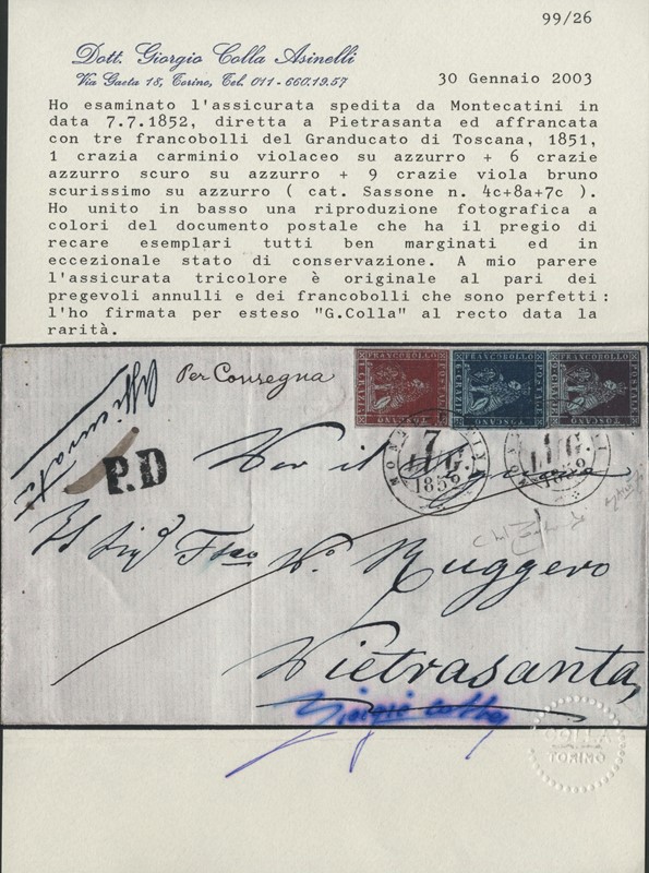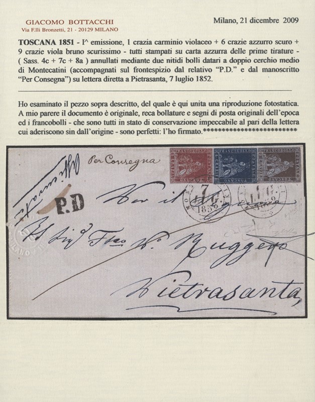 1851 - 1cr carminio violaceo, 6cr azzurro scuro, 9cr viola bruno scurissimo, tutti su carta azzurra e con ottimi margini bianchi, in affrancatura tricolore su lettera 'PER CONSEGNA' (manoscritto) da 'MONTECATINI 7 LUG. 1852' a Pietrasanta. Rarissima e Splendida. Sigla Raybaudi, CF Colla, Bottacchi e Zanaria (Sassone 4c+7c+8a - Euro -)