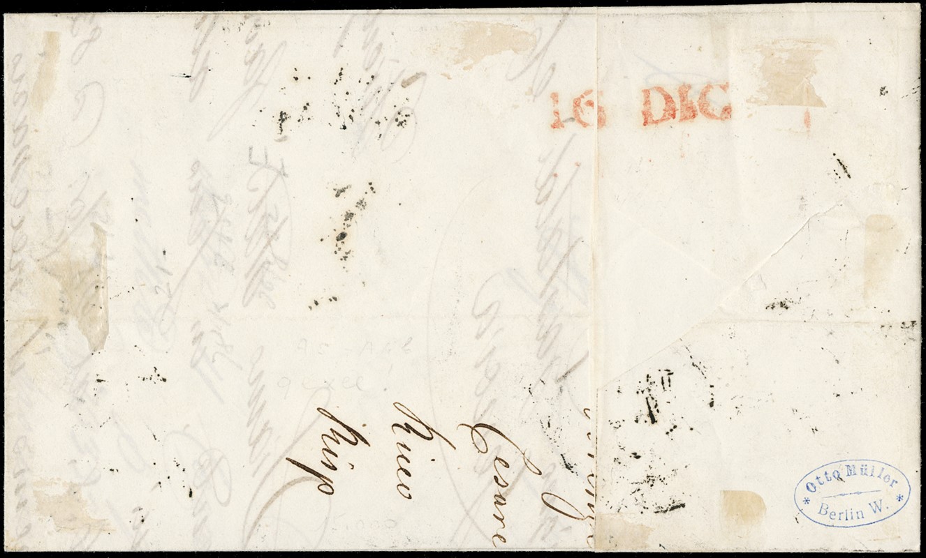 1851 - 1cr carminio violaceo e 2cr azzurro vivo, entrambi su carta azzurra, annullarti con 'muto a ragno' da 'FIRENZE 10 DIC 1851' a Genova; lettera freschissima con francobolli ben marginati. Firma Giulio Bolaffi, sigla A.Diena (Sassone 4c+5b+pt.9 - Euro 6.550)