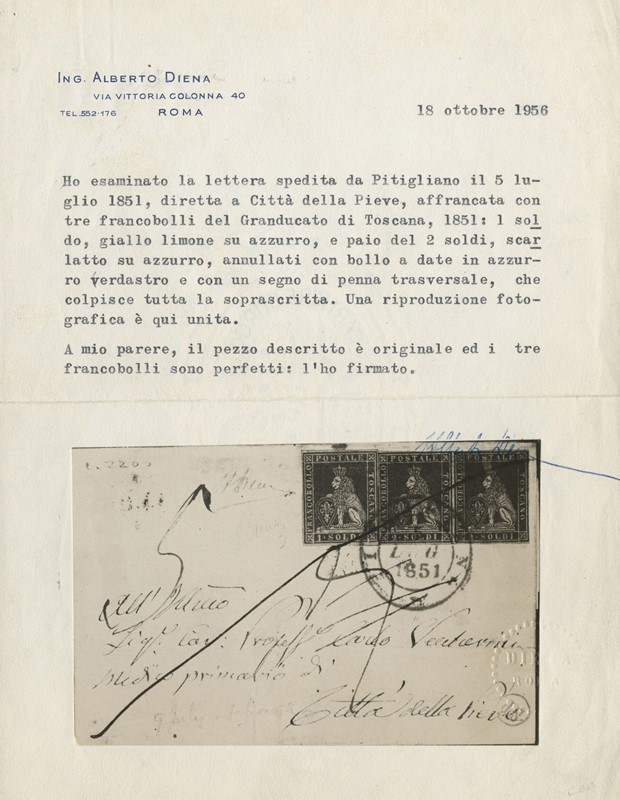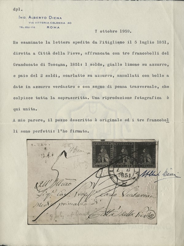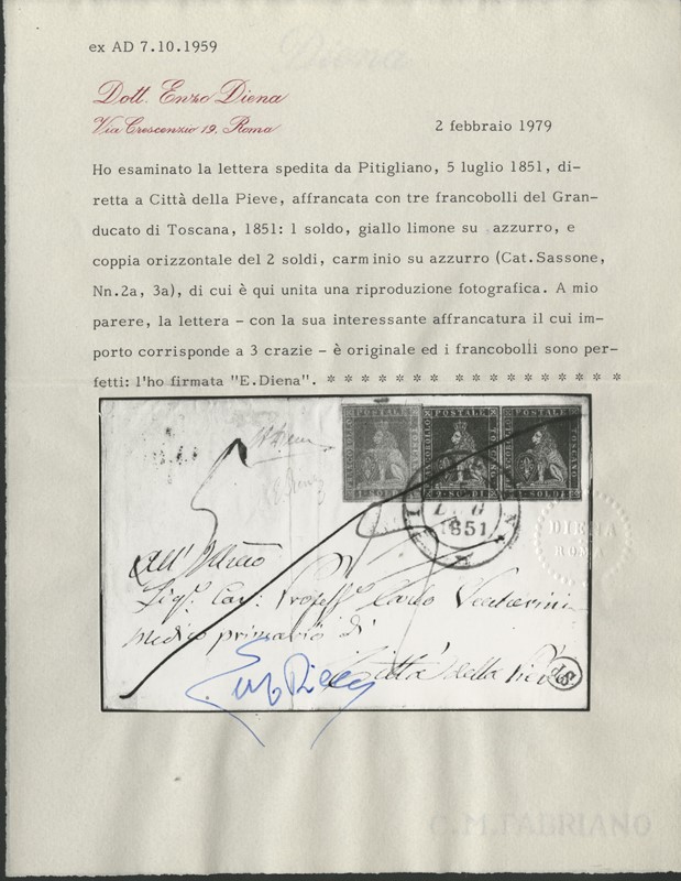 1851 - 1s giallo limone su azzurro e coppia orizzontale del 2s carminio su azzurro, tutti con filetti completi, da 'PITIGLIANO 5 LUG 1851' a Citta' della Pieve. Firma Em.Diena, 2 CF A.Diena e CF E.Diena (Sassone 2a+3+pt.12 - Euro 99.500)
