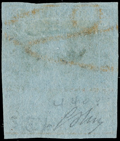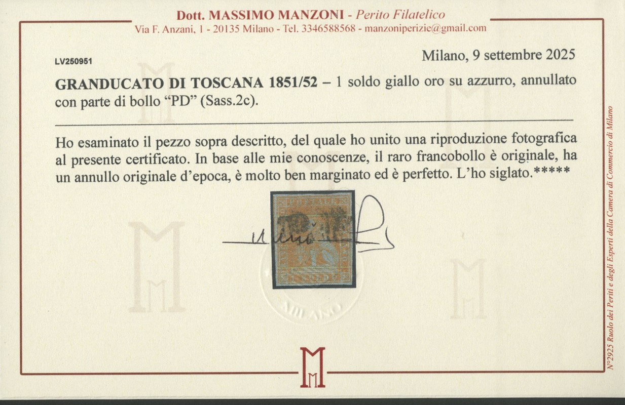 1851 - 1s giallo oro su carta azzurra, usato con margini bianchi su tutti i lati. Sigla Gugliemo Oliva, CF Manzoni (Sassone 2c - Euro 3.750)