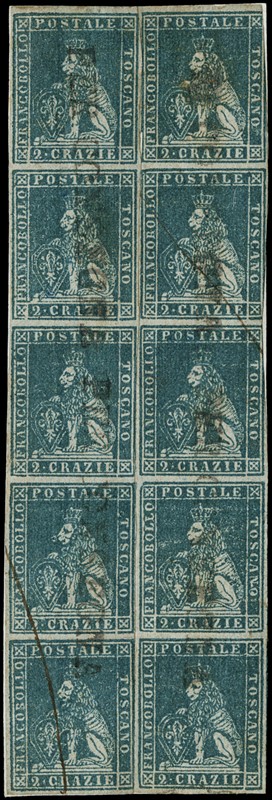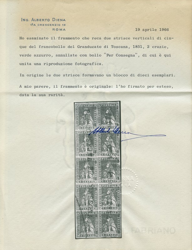 1851 - 2cr verde azzurro su carta grigia, due ST5 verticali che in origine formavano un unico BL10, annullate piu' volte con lineare 'PER CONSEGNA' e con tratti a penna, su frammentino. Qualche difetto di marginatura, insieme comunque rarissimo e molto ben conservato. CF A.Diena (Sassone 5f - Euro 54.000 circa)