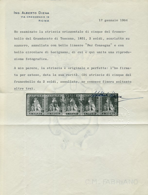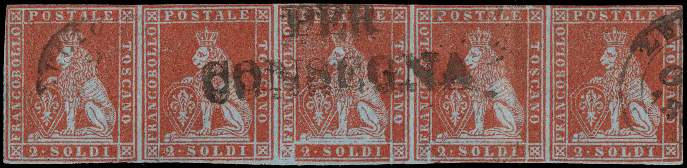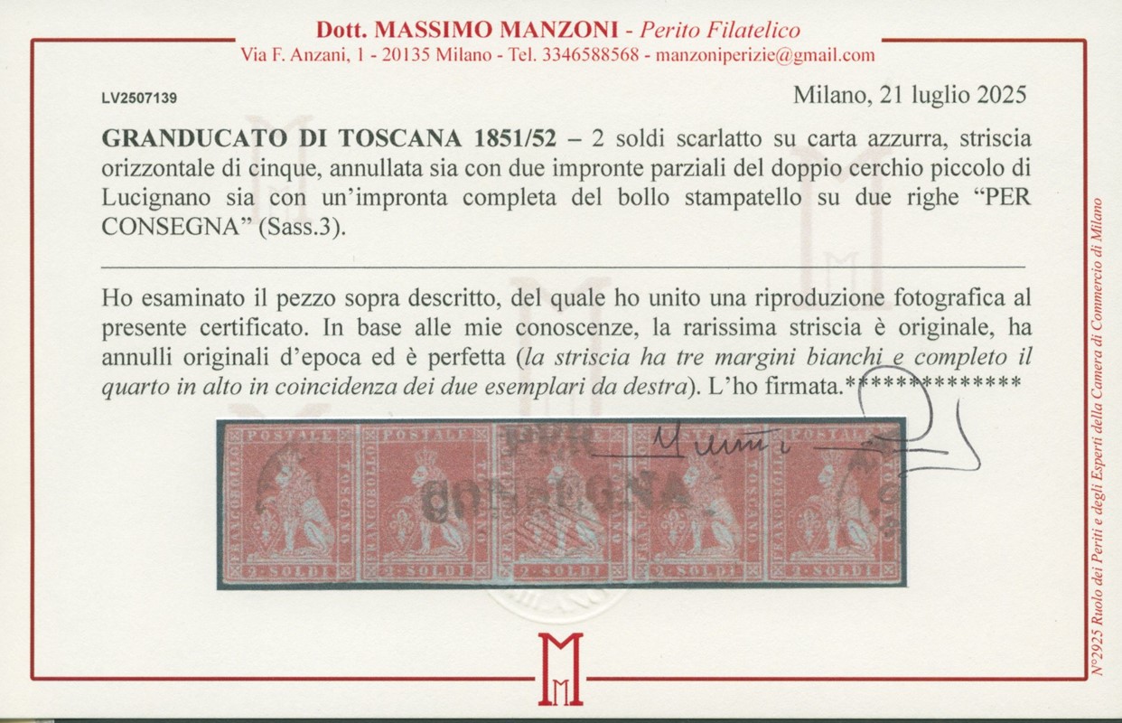 1851 - 2s scarlatto su carta azzurra, ST5 orizzontale annullata con lineare 'PER CONSEGNA' su due righe e con bolli circolari di Lucignano. Grande rarita' in ottime condizioni (tre margini bianchi, precisa in alto), una delle quattro note. Firma Guglielmo Oliva, CF A.Diena e Manzoni (Sassone 3+pt.13 - Euro 175.000+)