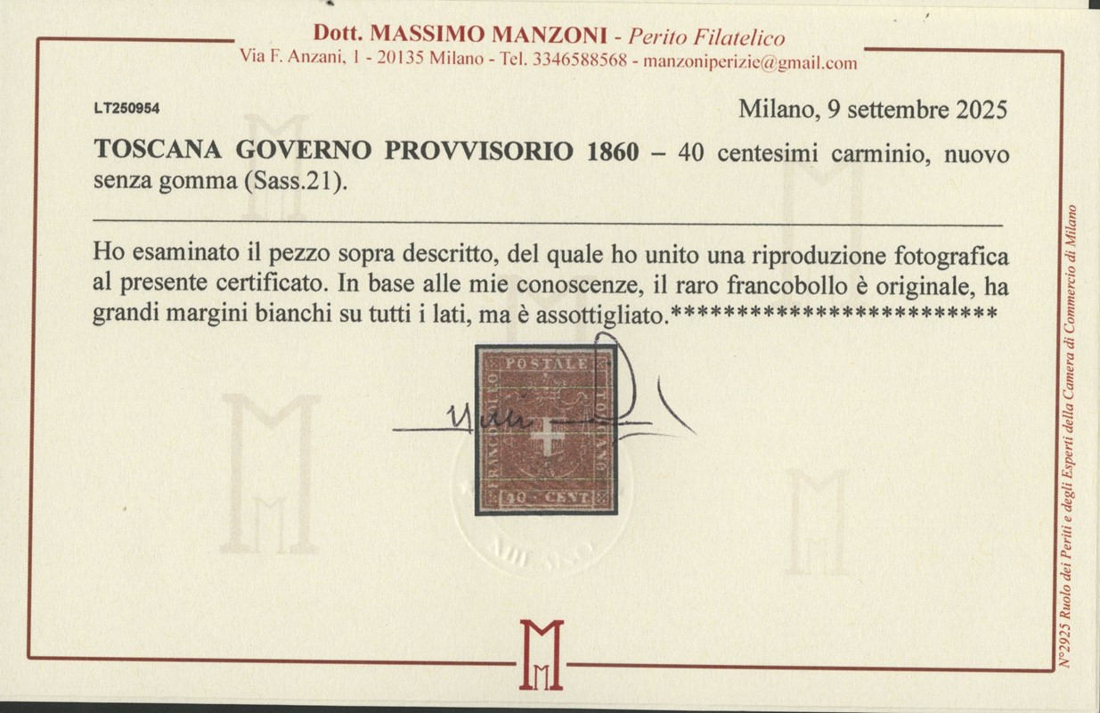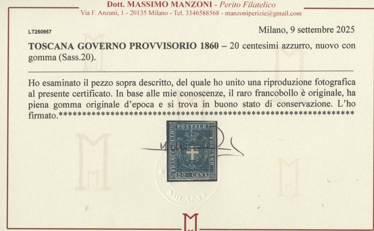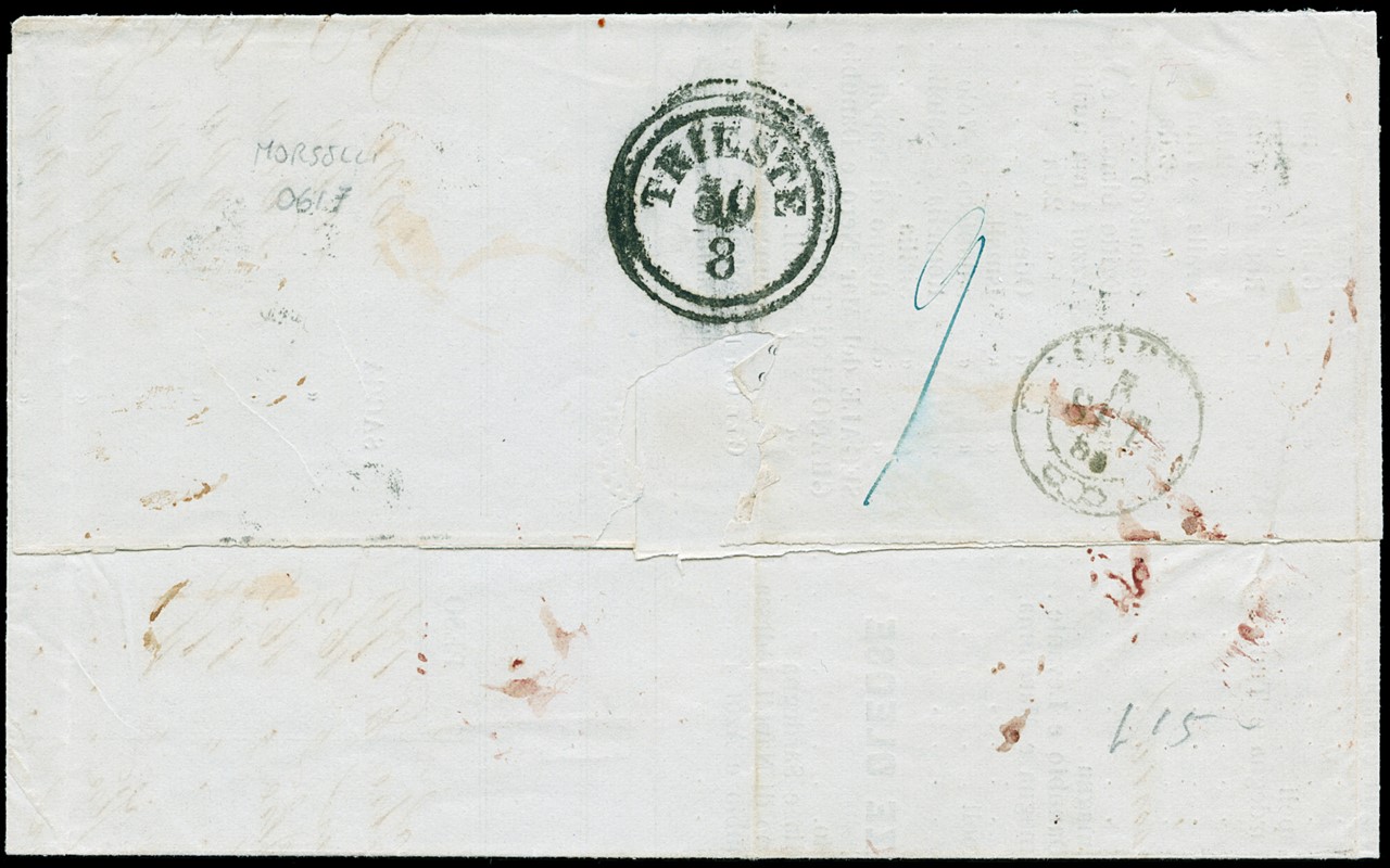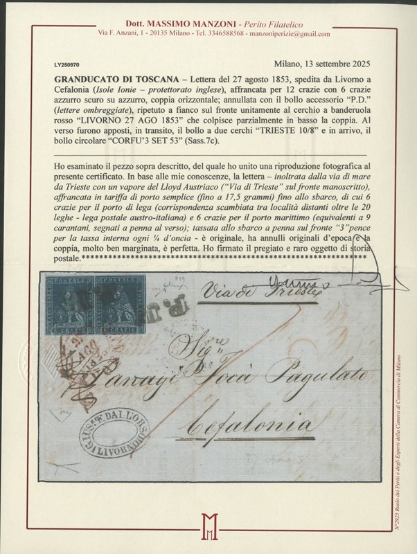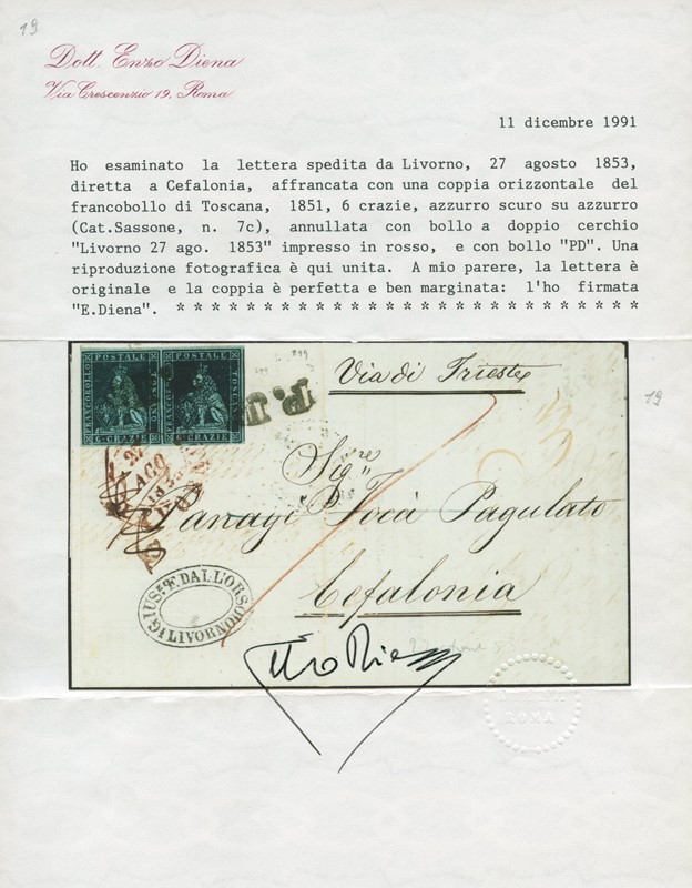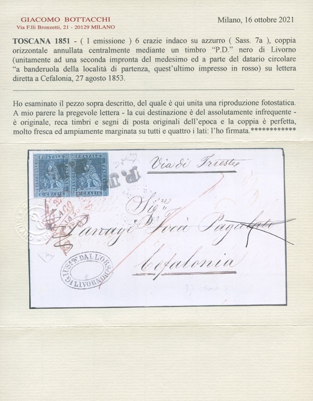1851 - 6cr indaco su azzurro, coppia con grandi margini da 'LIVORNO 27 AGO 53' (in rosso) con 'PD' nero sulla soprascritta, a Cefalonia per 'Via di Trieste'. Splendida, destinazione rara. CF E.Diena, Bottacchi e Manzoni (Sassone 7c - Euro 12.800)