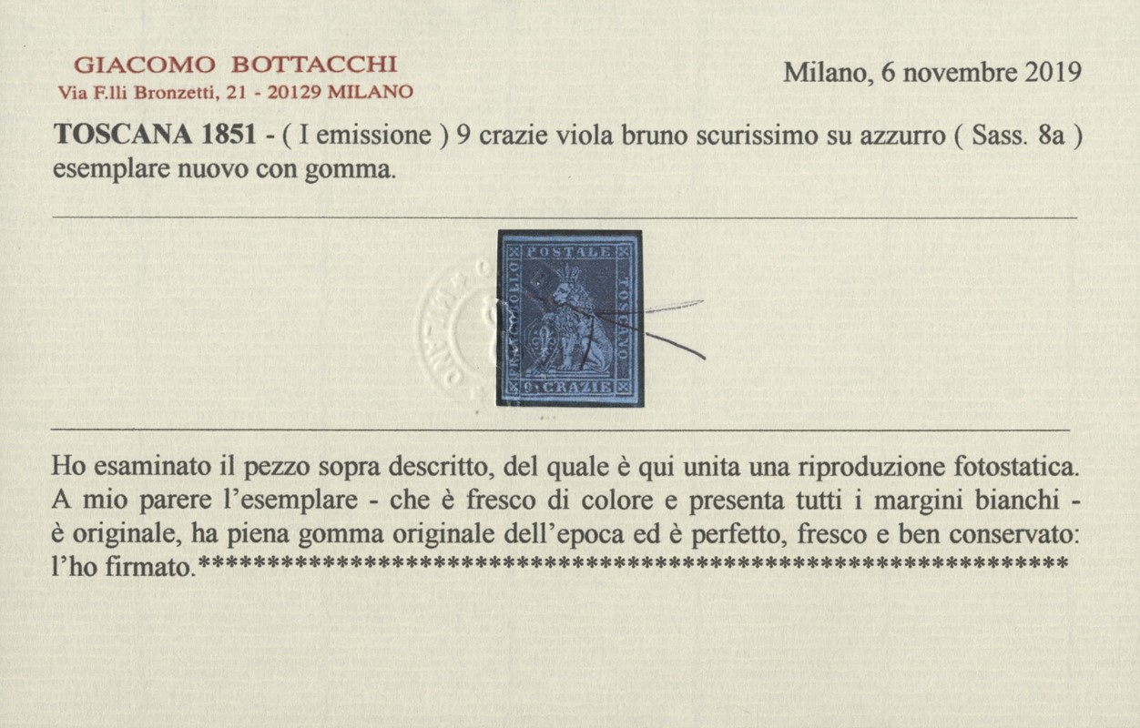 1851 - 9cr viola bruno scurissimo su carta azzurra, nuovo con piena gomma. Margini bianchi su tutti i lati. Splendido. CF A.Diena e Bottacchi (Sassone 8a - Euro 45.000)