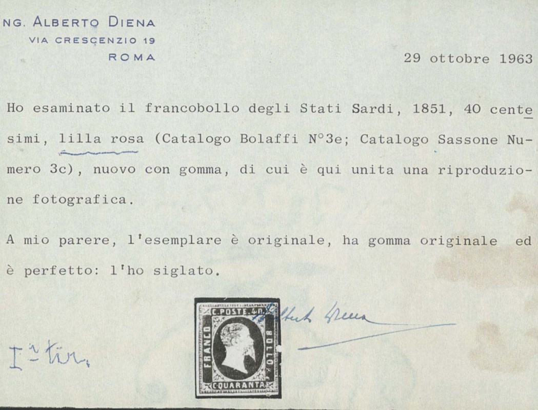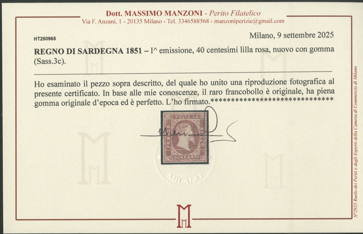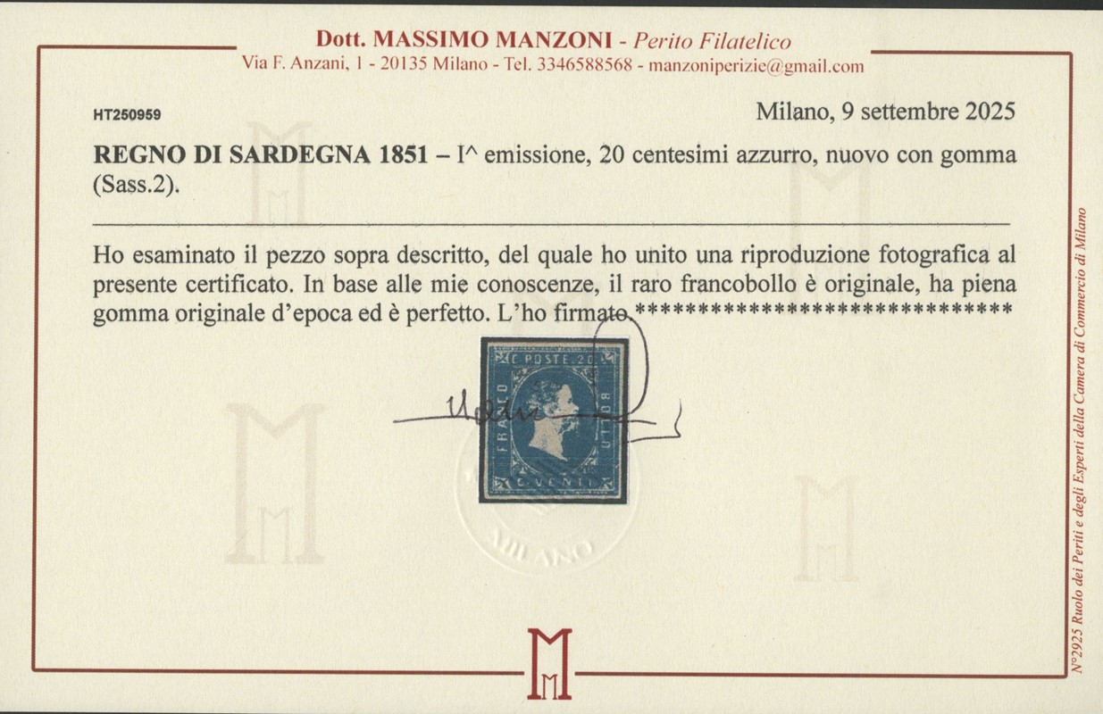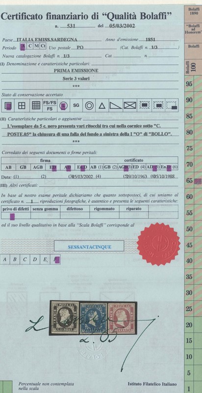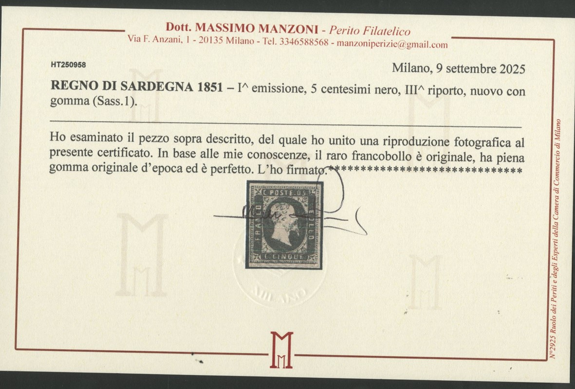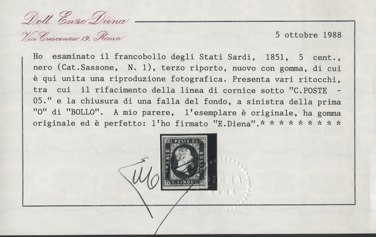 1851 - I emissione, i tre valori della serie: 5c nero, 20c azzurro e 40c lilla rosa, nuovi con gomma. CF E.Diena per il 5c, A.Diena per il 40c, Bolaffi e Manzoni per tutti (Sassone 1/3c - Euro 130.000)