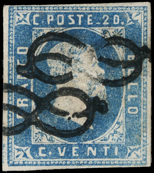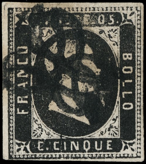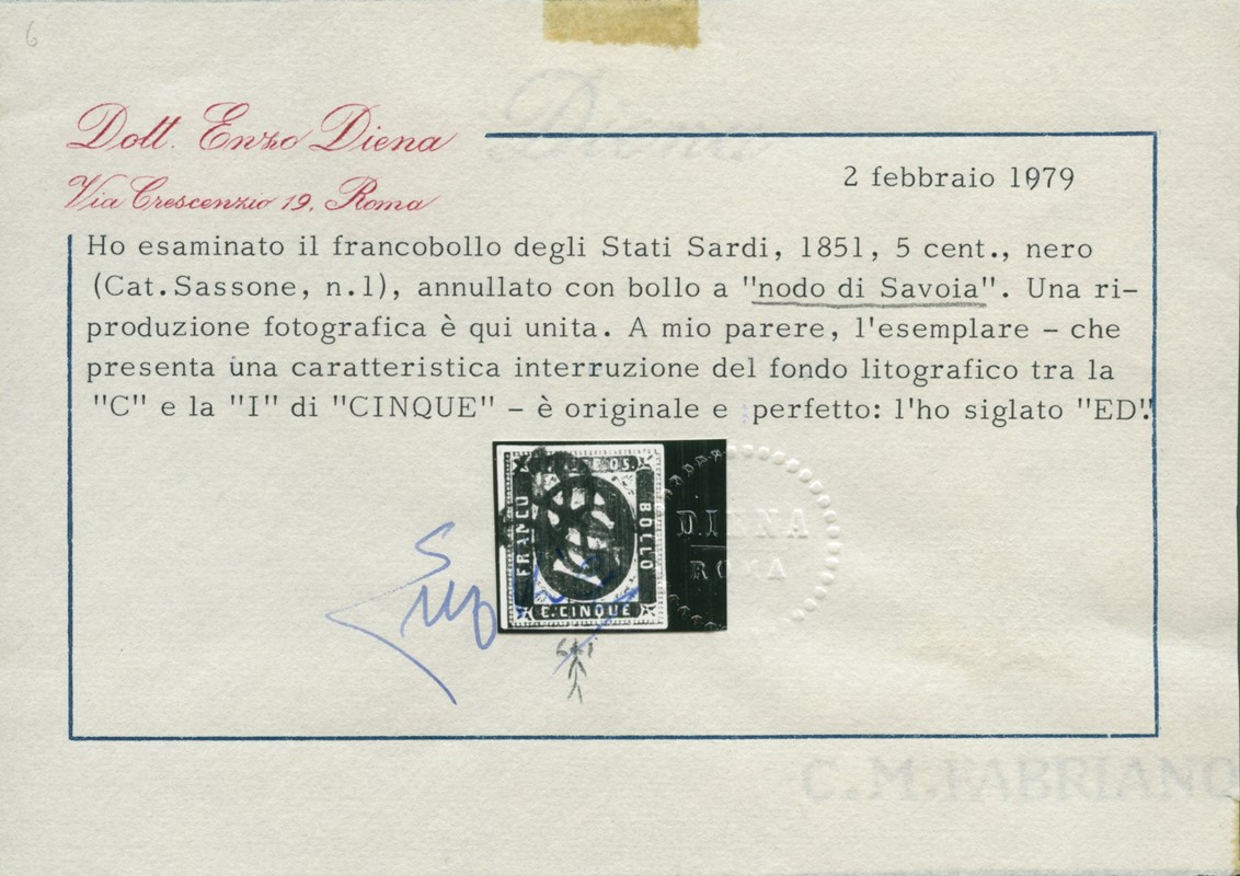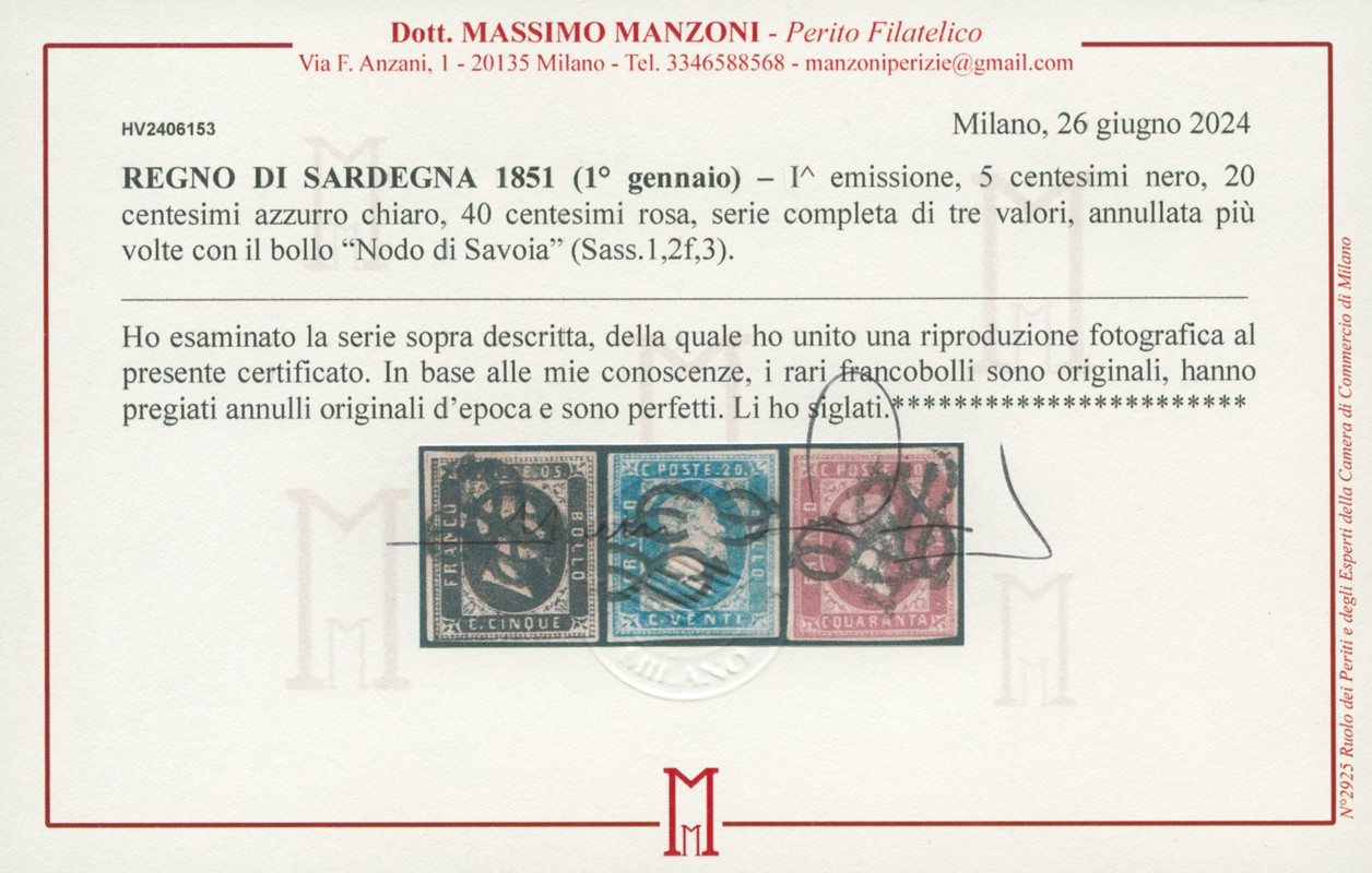 1851 - I emissione, i tre valori perfetti e molto ben marginati, annullati con doppi 'nodo di Savoia'. Sigle Em. e A.Diena, CF E.Diena per il 5c e Manzoni per tutta la serie (Sassone 1+2f+3 - Euro 14.200++)