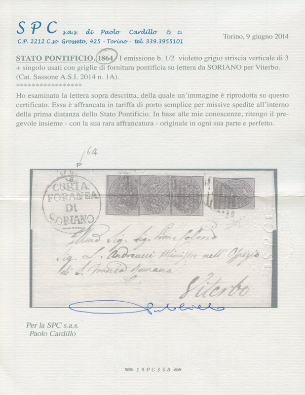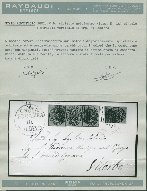 1852 - 1/2 b violetto, striscia verticale di tre e singolo da Soriano a Viterbo. Firma Raybaudi, sigla A.Diena, CF Raybaudi (Sassone 1Aa - Euro 7.000)
