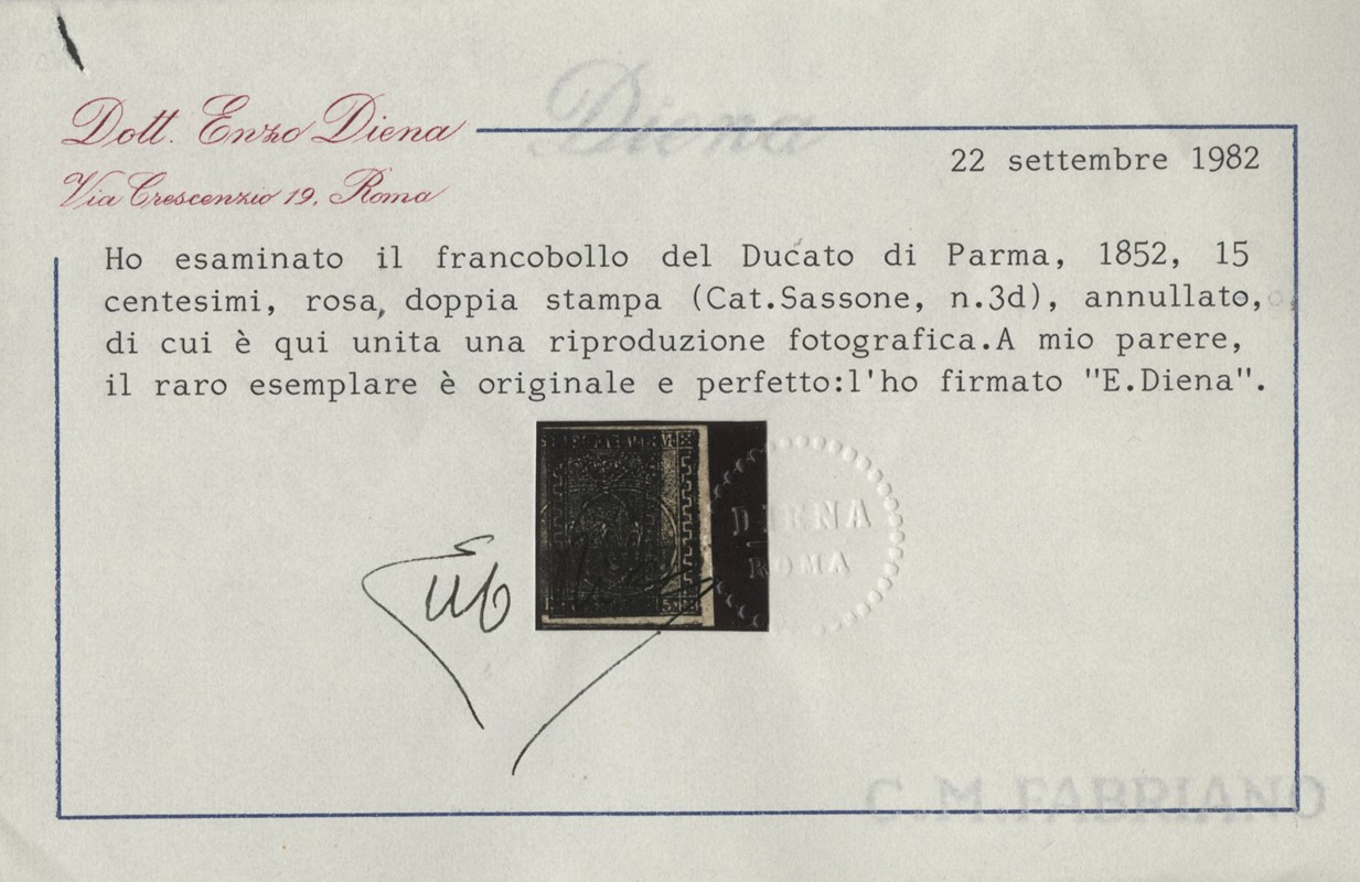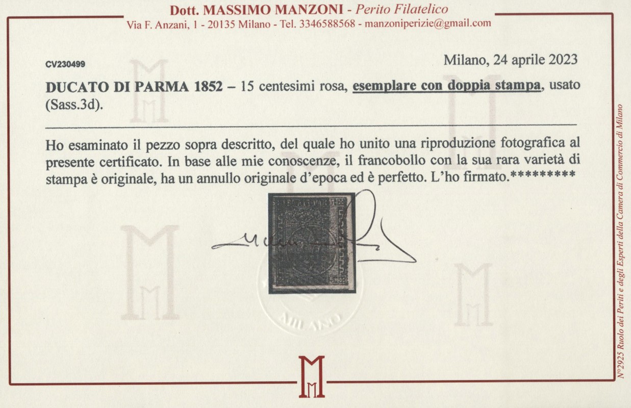 1852 - 15c rosa, doppia stampa particolarmente evidente e grandi margini. Raro, CF E.Diena e Manzoni (Sassone 3d - Euro 14.000+)