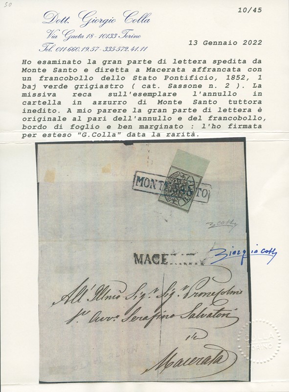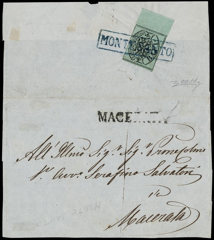 1852 - 1b verde grigiastro, BdF a destra, al verso di gran parte di lettera (mancante delle sguardie laterali), da 'MONTESANTO' (in cartella, azzurro) per 'MACERATA' (SD al recto). Annullamento inedito e molto ben impresso. Rarita'. CF Colla (Sassone 2+pt.R3 -stima- Euro 52.500+)