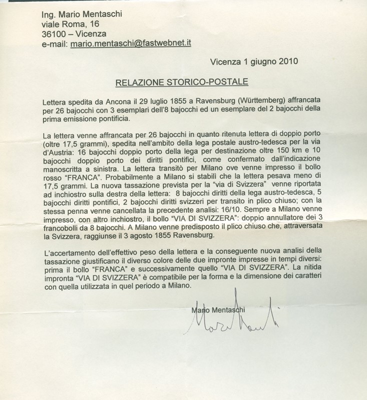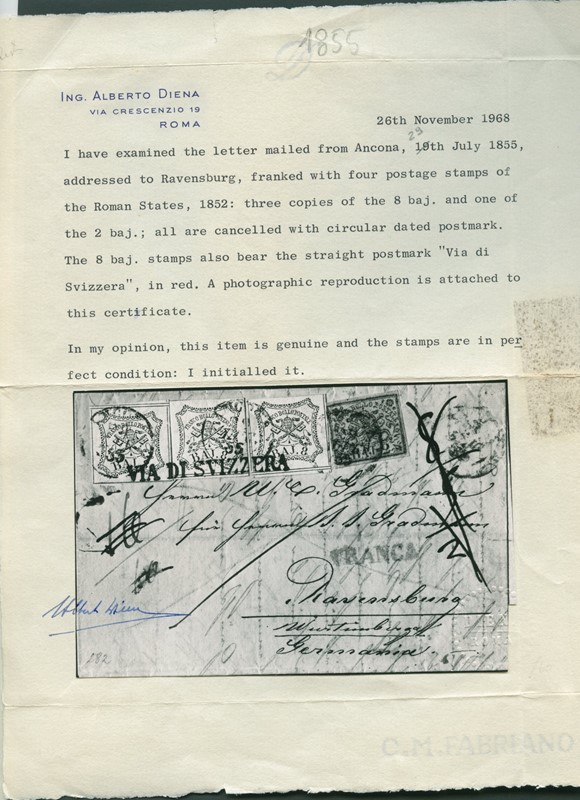 1852 - 2b verde giallastro, stampa oleosa, e 8b bianco, tre esemplari, da 'ANCONA 29 LUG 55' per RAVENSBURG, Wurttemberg, Germania, 'VIA DI SVIZZERA' (lineare rosso sugli 8b). Interessantissima. CF Vaccari, A.Diena e Mentaschi (Sassone 3b+9 - Euro - )