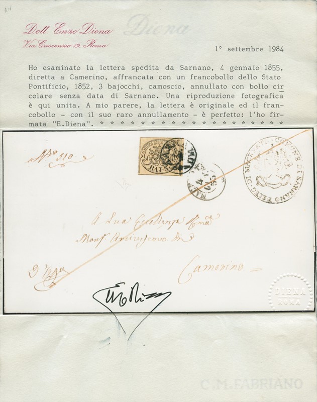1852 - 3b camoscio da 'SARNANO' (bollo circolare nero) a Camerino. Raro, CF E.Diena (Sassone 4c+pt.13 - Euro 9.000+)