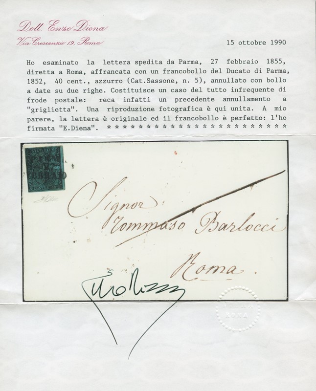 1852 - 40c azzurro, esemplare recuperato da precedente affrancatura e riutilizzato in frode da 'PARMA 27 FEBBRAIO' 1855 per Roma. Interessantissima e rara frode dell'epoca, CF E.Diena (Sassone 5 - Euro 5.250+)