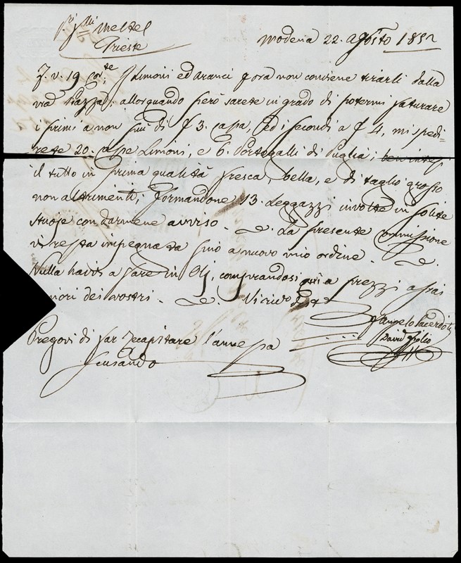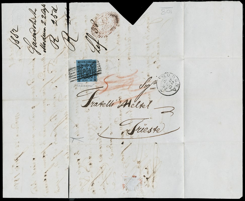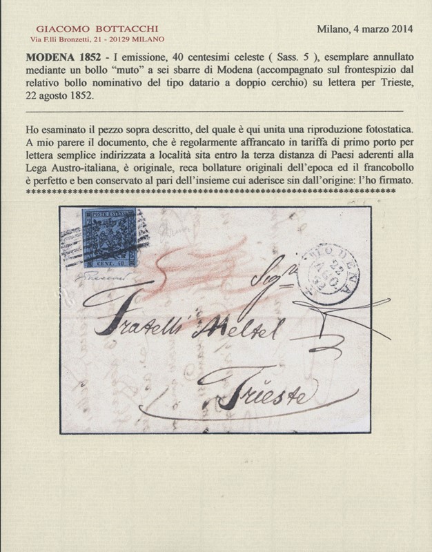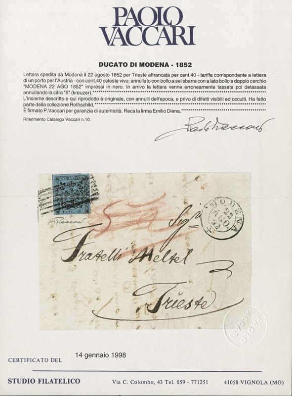 1852 - 40c celeste vivo da 'MODENA 22 AGO 52' a Trieste, tariffa corrispondente a lettera di un porto per l'Austria, la missiva venne erroneamente tassata e poi detassata annullando la cifra 5 (kreuzer). Ex collezione Rotschild, CF Vaccari e Bottacchi (Sassone 5 - Euro 25.000)