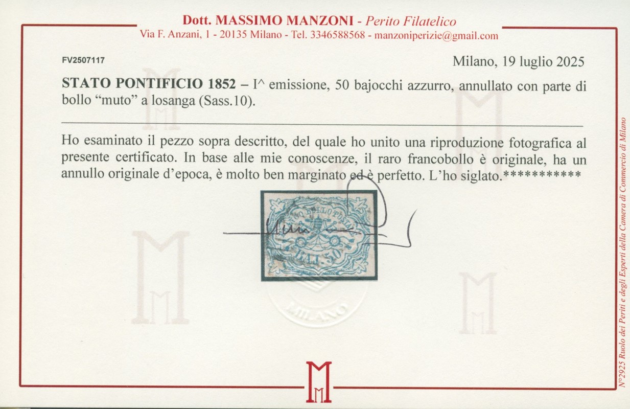 1852 - 50b azzurro, ampi margini, annullato a griglia. Firma Mezzadri, CF Fiecchi e Manzoni (Sassone 10 - Euro 3.500)