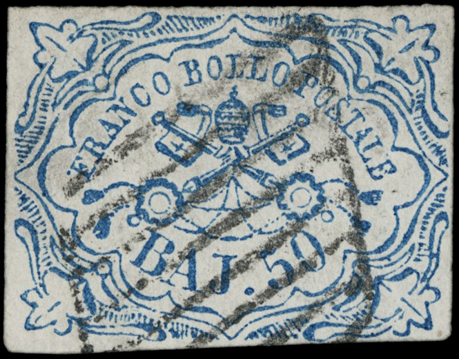 1852 - 50b azzurro annullato a griglia. Sigla Fiec