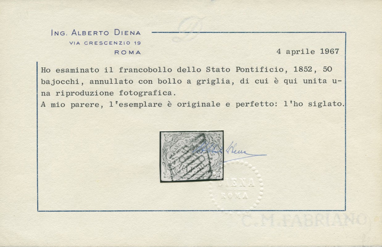 1852 - 50b azzurro annullato a griglia. Sigla Fiecchi, CF A.Diena (Sassone 10 - Euro 3.500)
