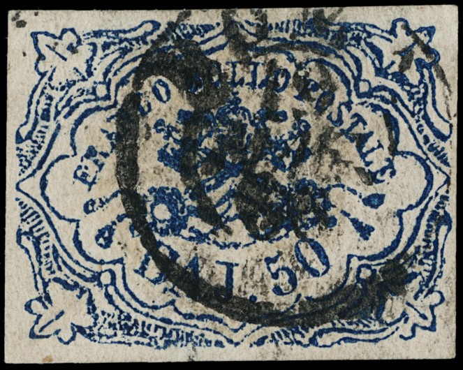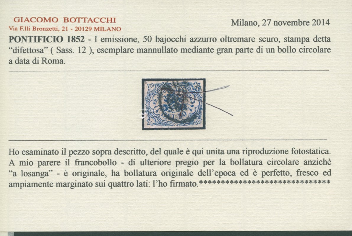 1852 - 50b azzurro oltremare scuro stampa difettosa, ben marginato, annullato con bollo circolare di 'ROMA'. Sigla A.Diena, CF Bottacchi (Sassone 12 - Euro 11.000)
