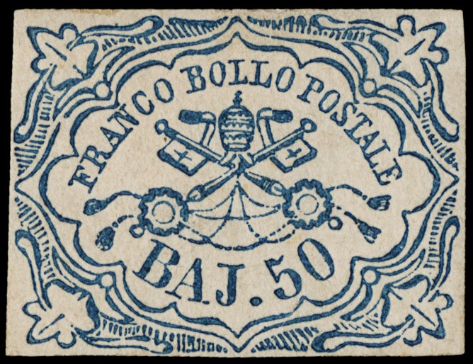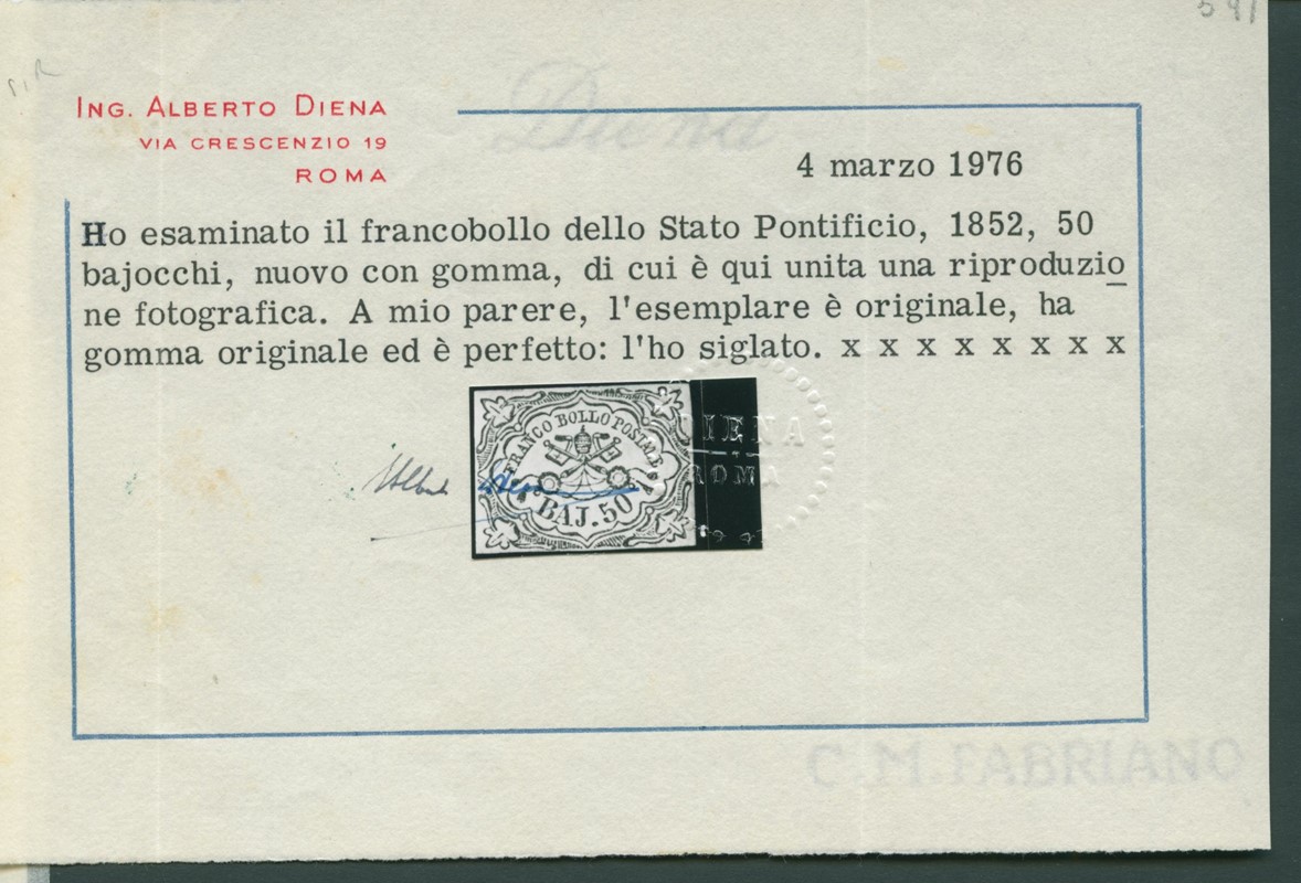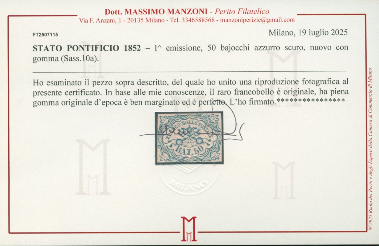 1852 - 50b azzurro scuro, ben marginato. Raro. CF A.Diena e Manzoni (Sassone 10a - Euro 50.000)