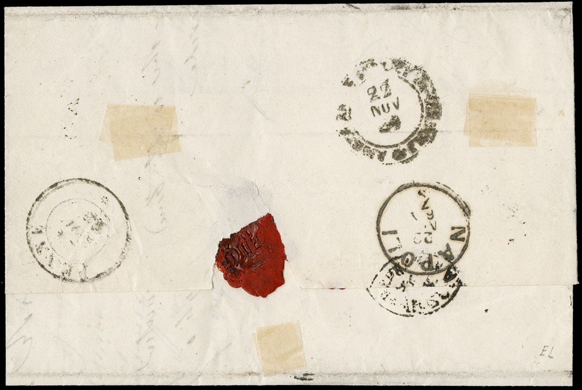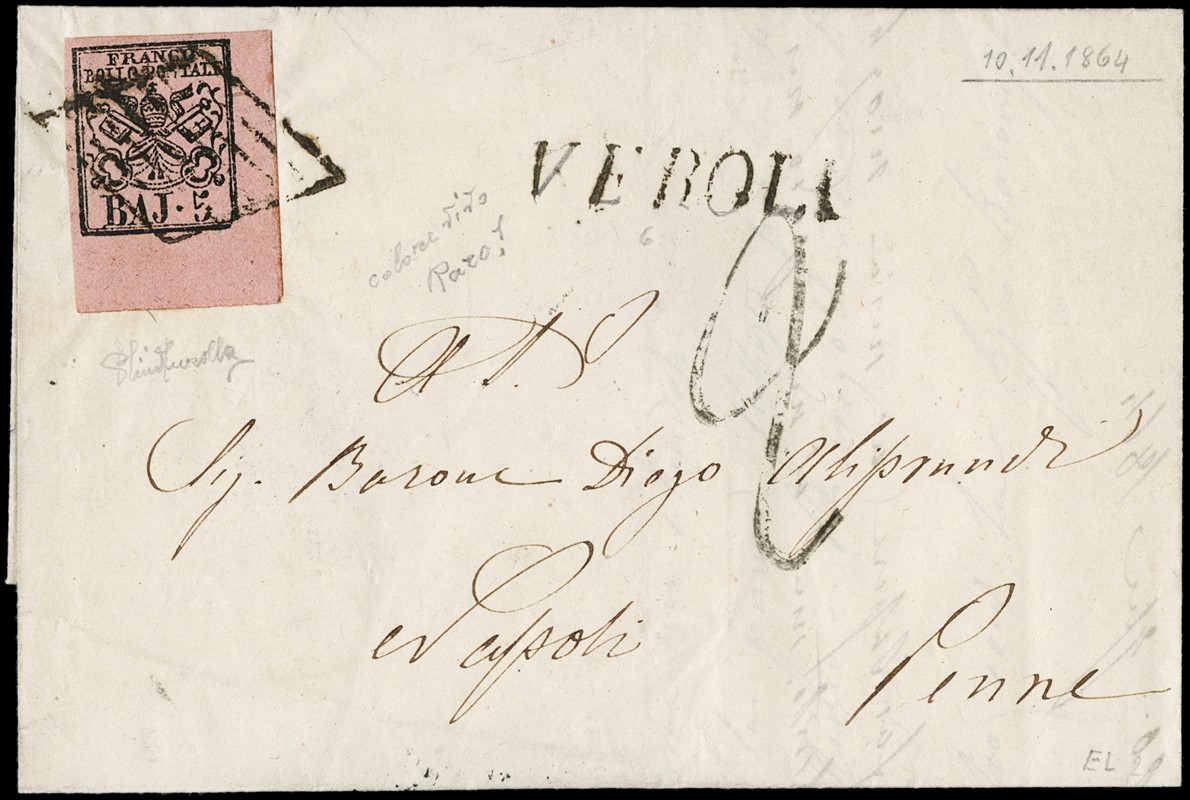 1852 - 5b rosa vinaceo AdF inferiore destro, da 'VEROLI' a Penne, Napoli, con arrivo il 22 novembre 1852. Splendida tinta estrema del rosa vinaceo. Firma Turolla (Sassone 6Aa - Euro - )