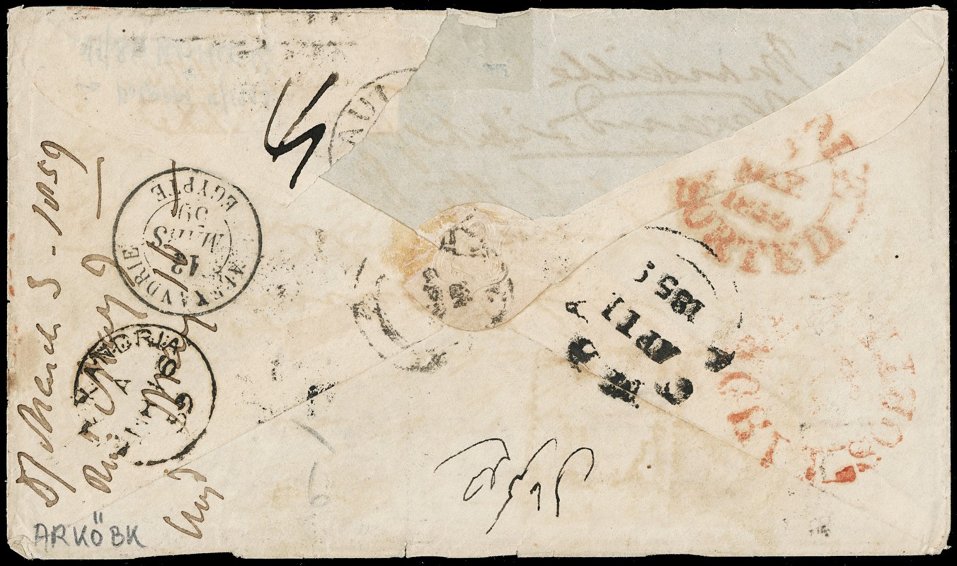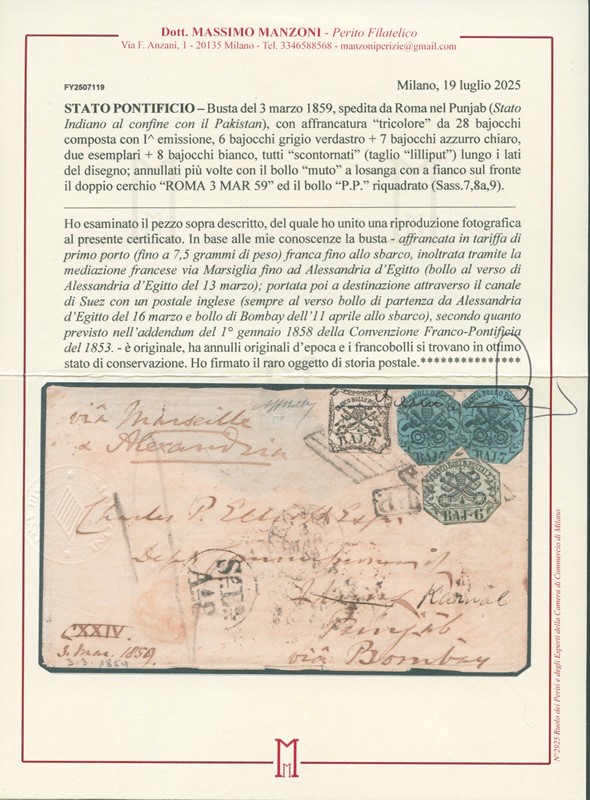 1852 - 6b grigio verdastro, 7b azzurro due esemplari e 8b bianco, tutti ritagliati 'Lilliput' da 'ROMA 3 MAR 59' per l'India, via Alessandria e Bombay. Interessantissima combinazione e rara destinazione. Firma A.Bolaffi, CF Manzoni (Sassone 7+8+9 - Euro - )