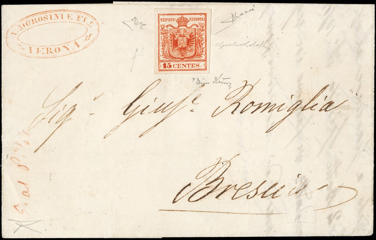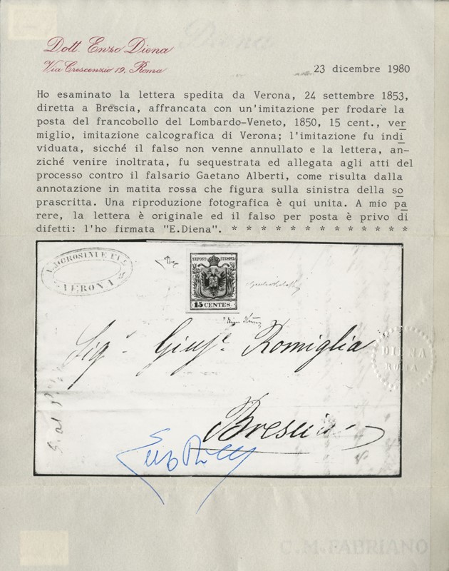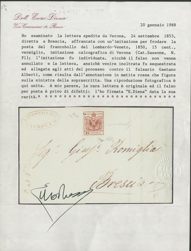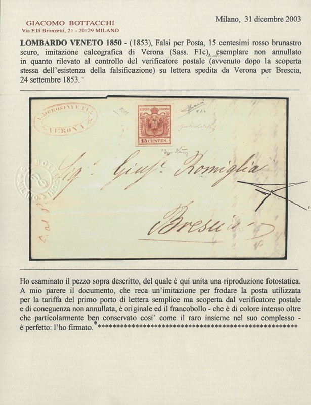 1853 - 15c rosso brunastro scuro, imitazione di Verona, su lettera da Verona a Brescia. Francobollo non annullato essendo stato intercettato dal verificatore postale. Rara. Firme Giulio Bolaffi, Fiecchi e Sorani, CF Bottacchi e due CF E.Diena (Sassone F1c - circa Euro 26.000)