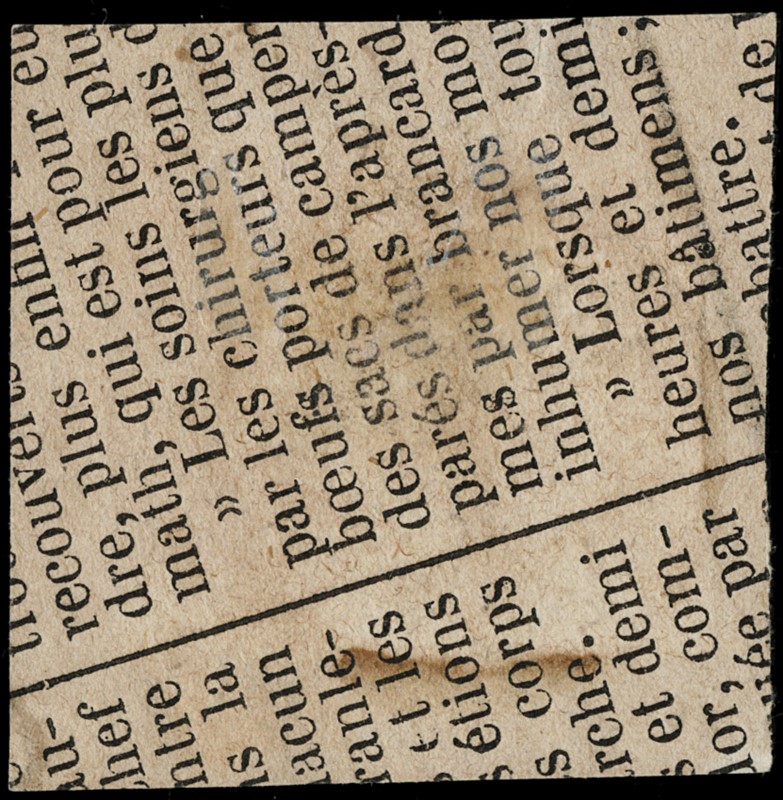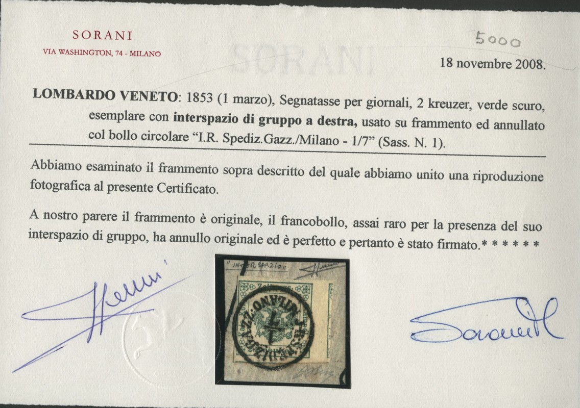 1853 - 2kr verde scuro, esemplare con interspazio orizzontale di gruppo a destra e parte dell'esemplare adiacente, annullato 'I.R. SPEDIZ. GAZZ. MILANO 1/7' su frammento. Unico esemplare noto, grande rarita' dei Segnatasse. Firma Guglielmo Oliva, CF Sorani (Sassone 1 - Euro 30.000+)