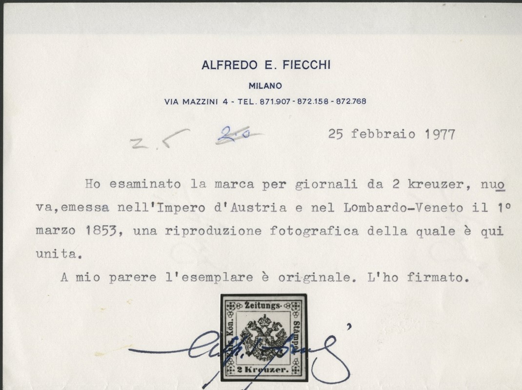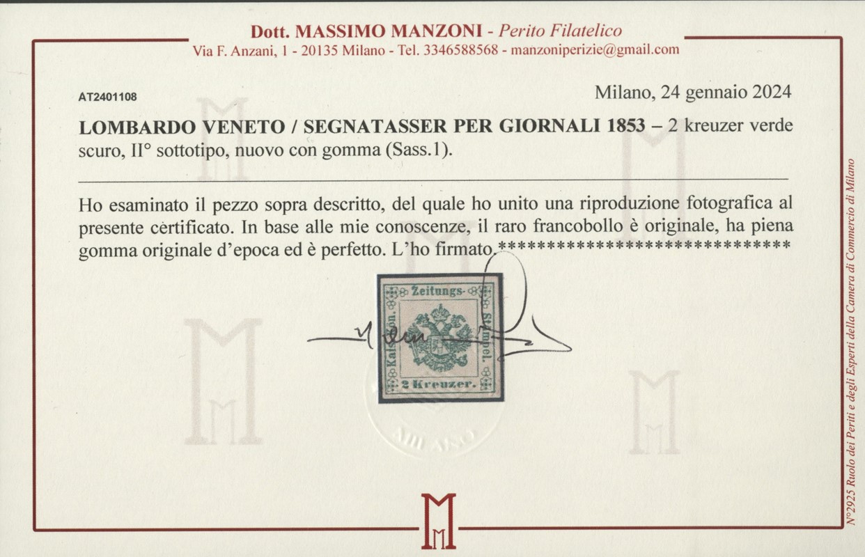 1853 - 2kr verde scuro. Raro e molto fresco. Sigle G.Oliva, Chiavarello, CF Fiecchi e Manzoni (Sassone STG1 - Euro 32.000)