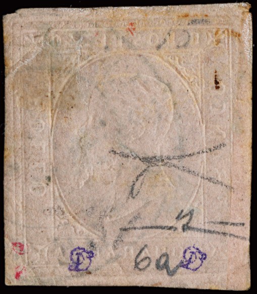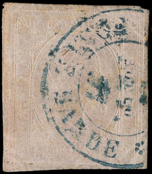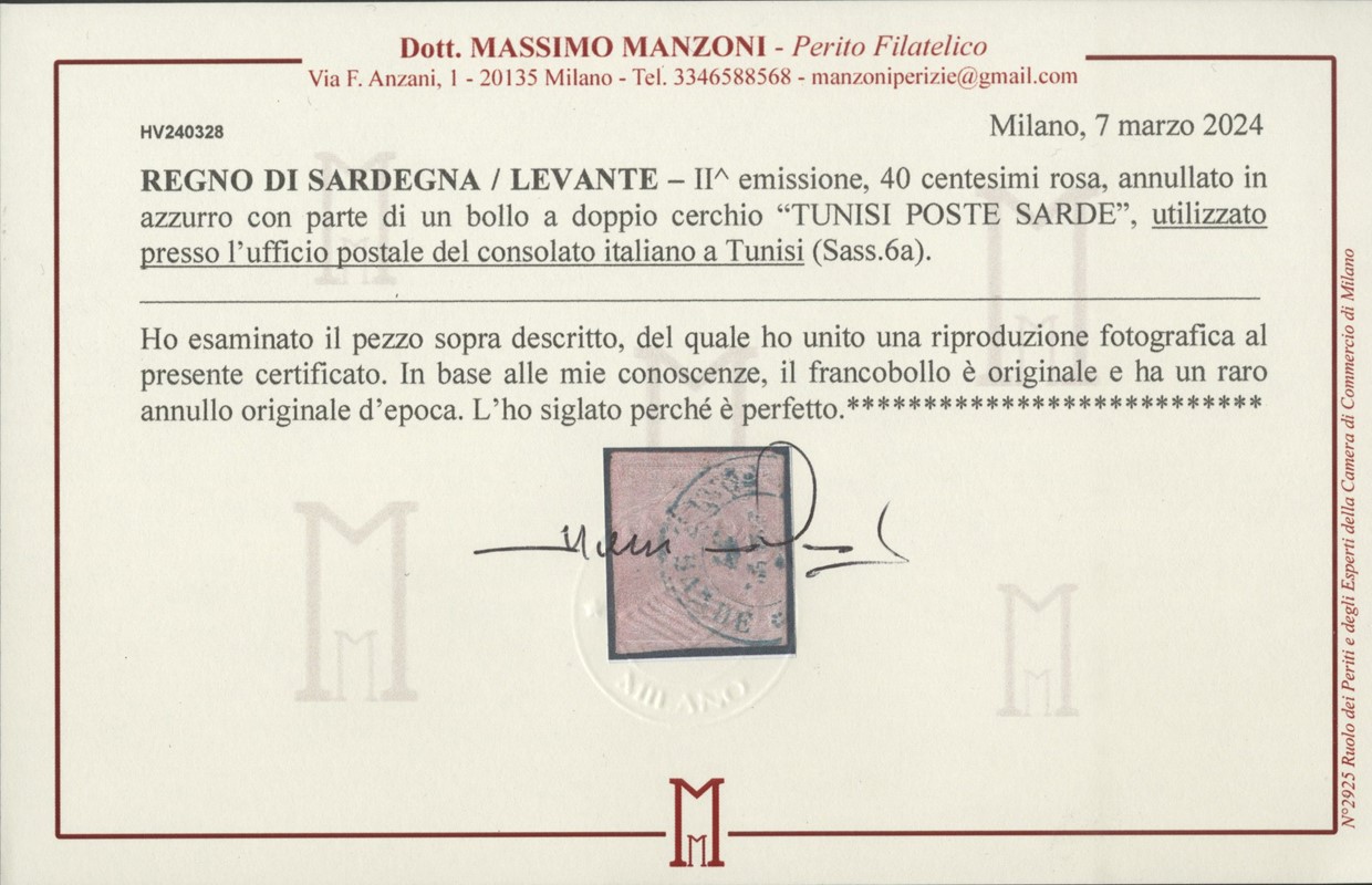 1853 - II emissione, 40c rosa annullato 'TUNISI POSTE SARDE' in azzurro. Raro annullamento di Levante su francobollo perfetto. Sigla Bottacchi, CF Manzoni (Sassone 6a + pt.R1 - Euro 6.750)