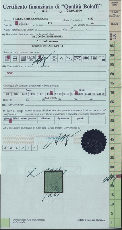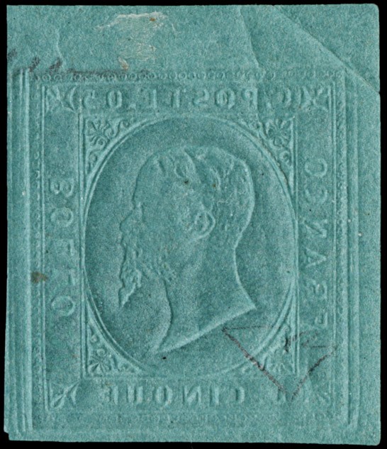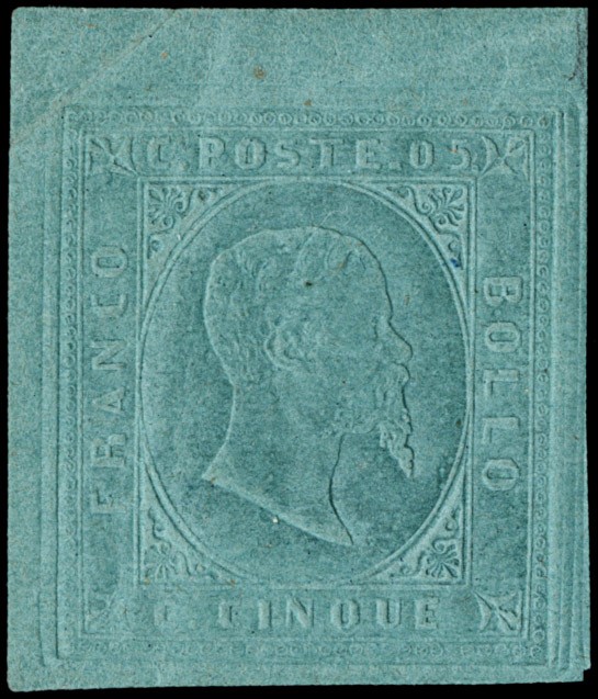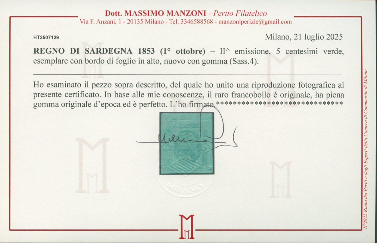1853 - II emissione, 5c verde, AdF con ampio margine superiore, nuovo. Piega sul bordo di foglio, esterna al disegno, raro e splendido. CF Bolaffi e Manzoni (Sassone 4 - Euro 45.000+)