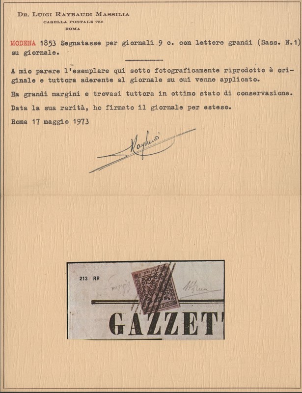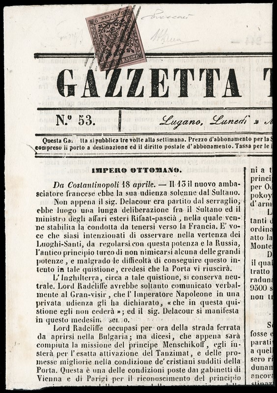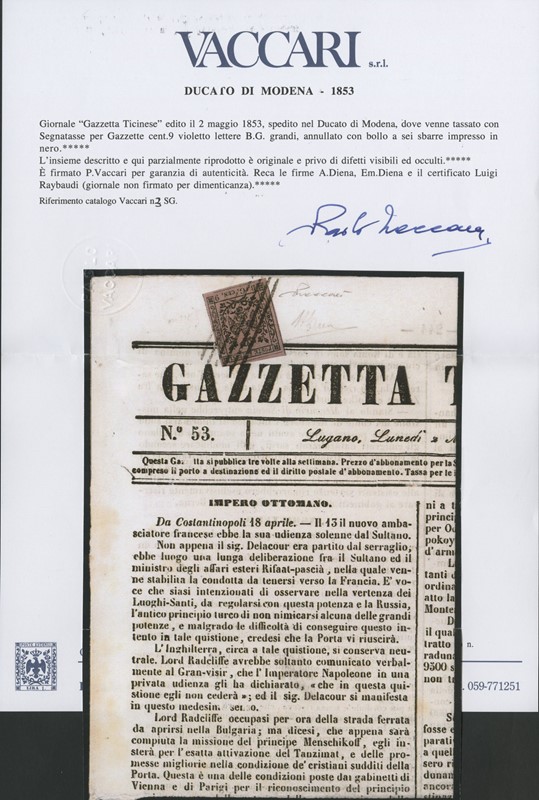 1853 - Segnatasse per Giornali 9C violetto grigio “B.G.' grandi, molto ben marginato, su “Gazzetta Ticinese' del 2 maggio 1853. Raro. Firma Em.Diena, CF Luigi Raybaudi e Vaccari (Sassone STG1 - Euro 16.500)