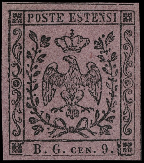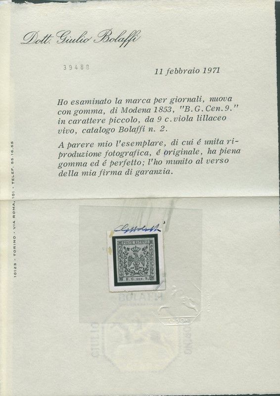 1853 - Segnatasse per Giornali 9c violetto lillaceo, grandi margini e SL. CF Giulio Bolaffi (Sassone 2a - Euro 4.000)