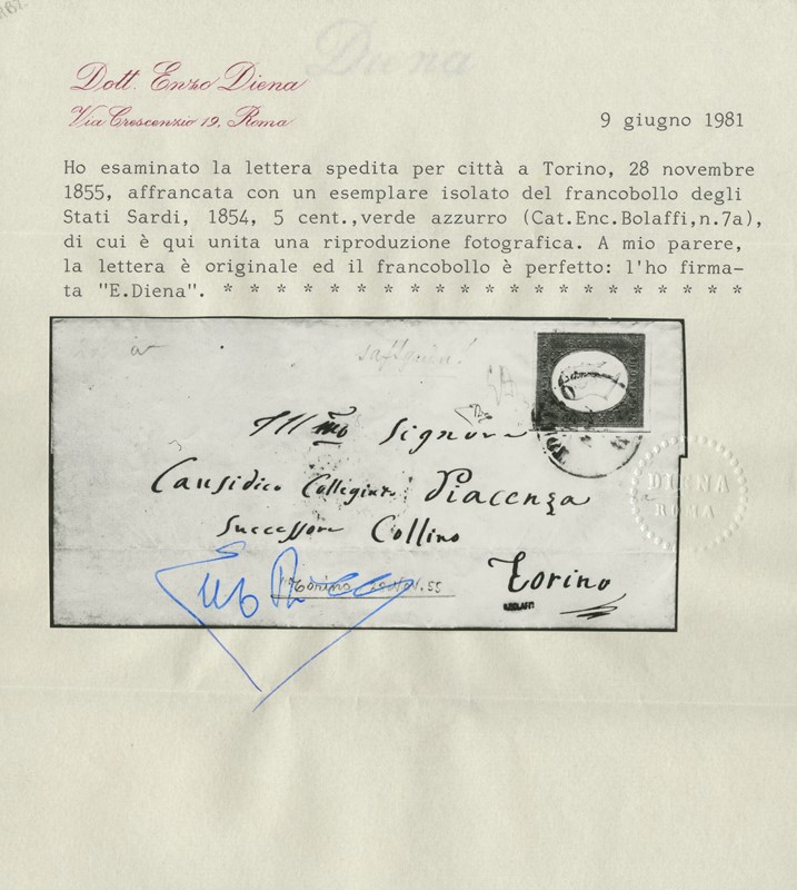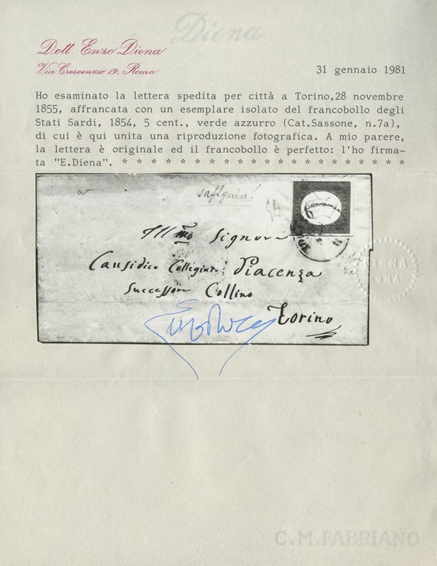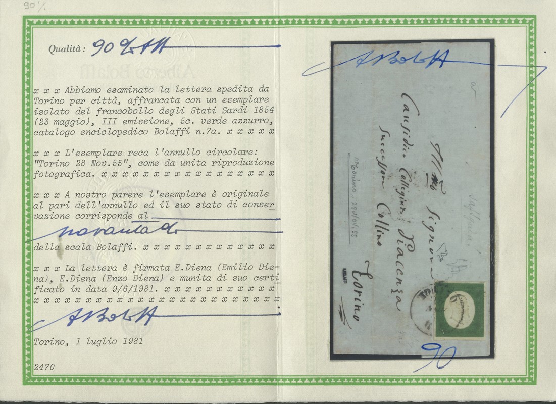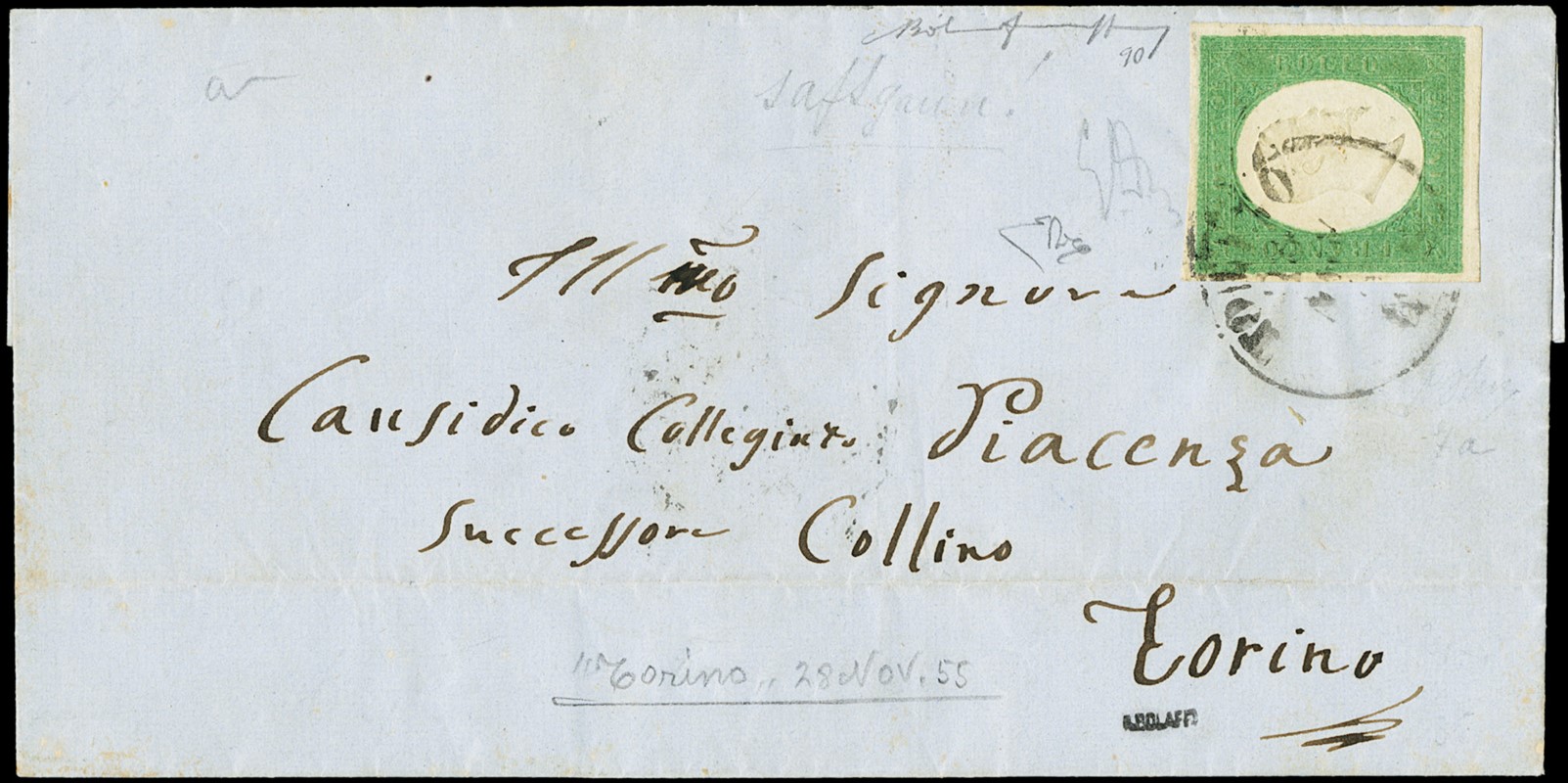 1854 - III emissione, 5c verde azzurro con grandi margini, uso isolato da 'TORINO 28 NOV 55' per citta'. CF E.Diena e Bolaffi 90% (Sassone 7a - in proporzione Euro 11.845+45%)