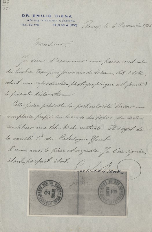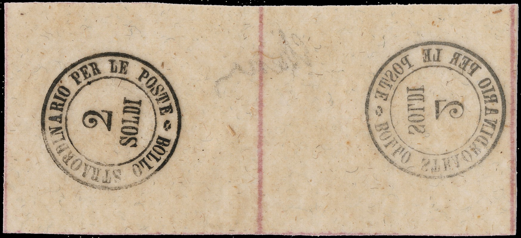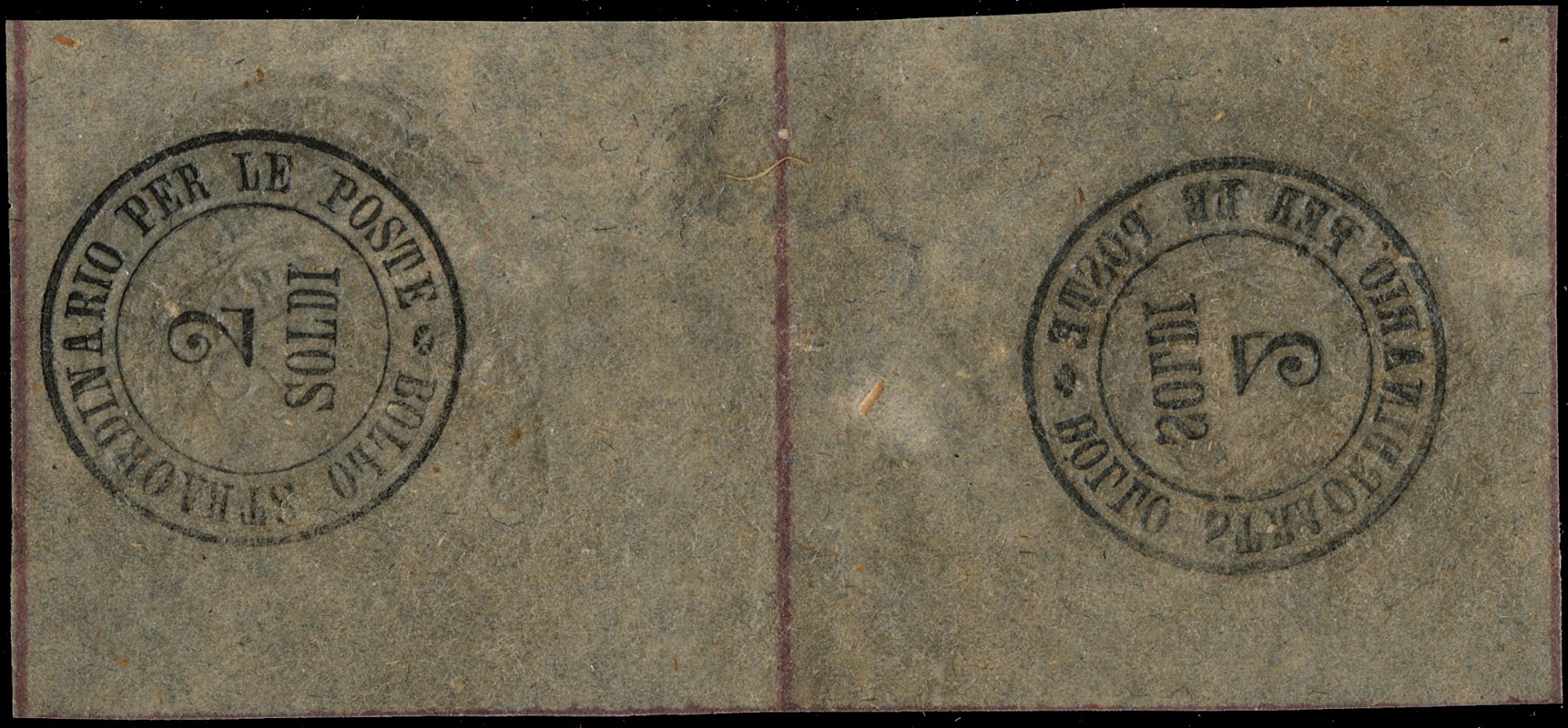 1854 - Segnatasse per giornali 2s nero, coppia 'tete-beche' con un esemplare impresso al verso, nuova con piena gomma. CF Em.Diena del 1935 (Sassone 1b - Euro 1.400)