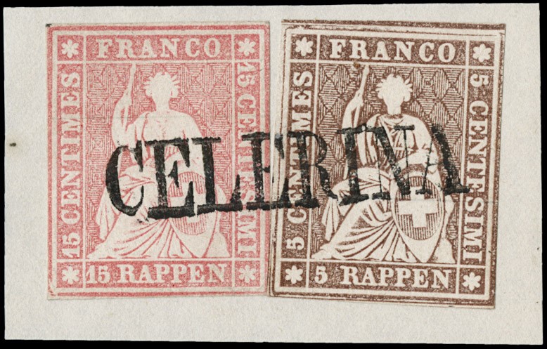 1854 - Strubel, 5rp marrone e 15rp rosa, entrambi su carta spessa, su frammento annullato con lineare 'CELERINA'. Firme A.Diena e Sorani (Zumstein 21G+24G - Euro - )