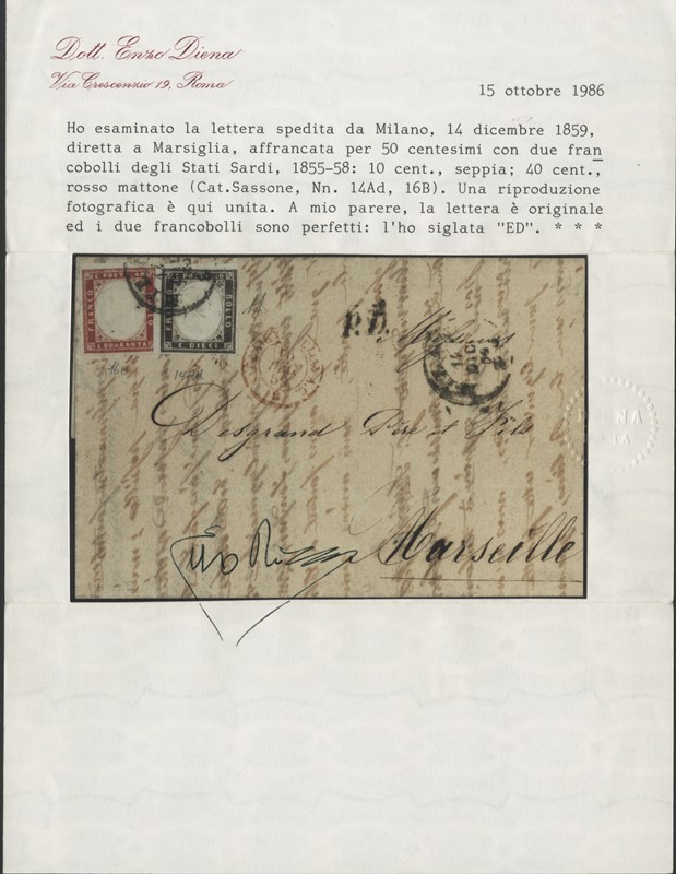 1855 - 10c bruno chiaro rosaceo (seppia) e 40c rosso mattone da 'MILANO 14 DIC 59' a Marsiglia. CF E.Diena e Casimiro Toselli (Sassone 14Ad+16B - Euro 5.100)