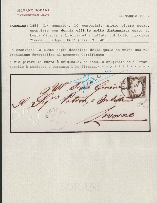 1855 - 10c grigio bistro scuro con doppia effigie molto distanziata (7 mm) su lettera da 'LUCCA 30 AGO 61' a Livorno. CF Sorani (Sassone 14CF - Euro -)