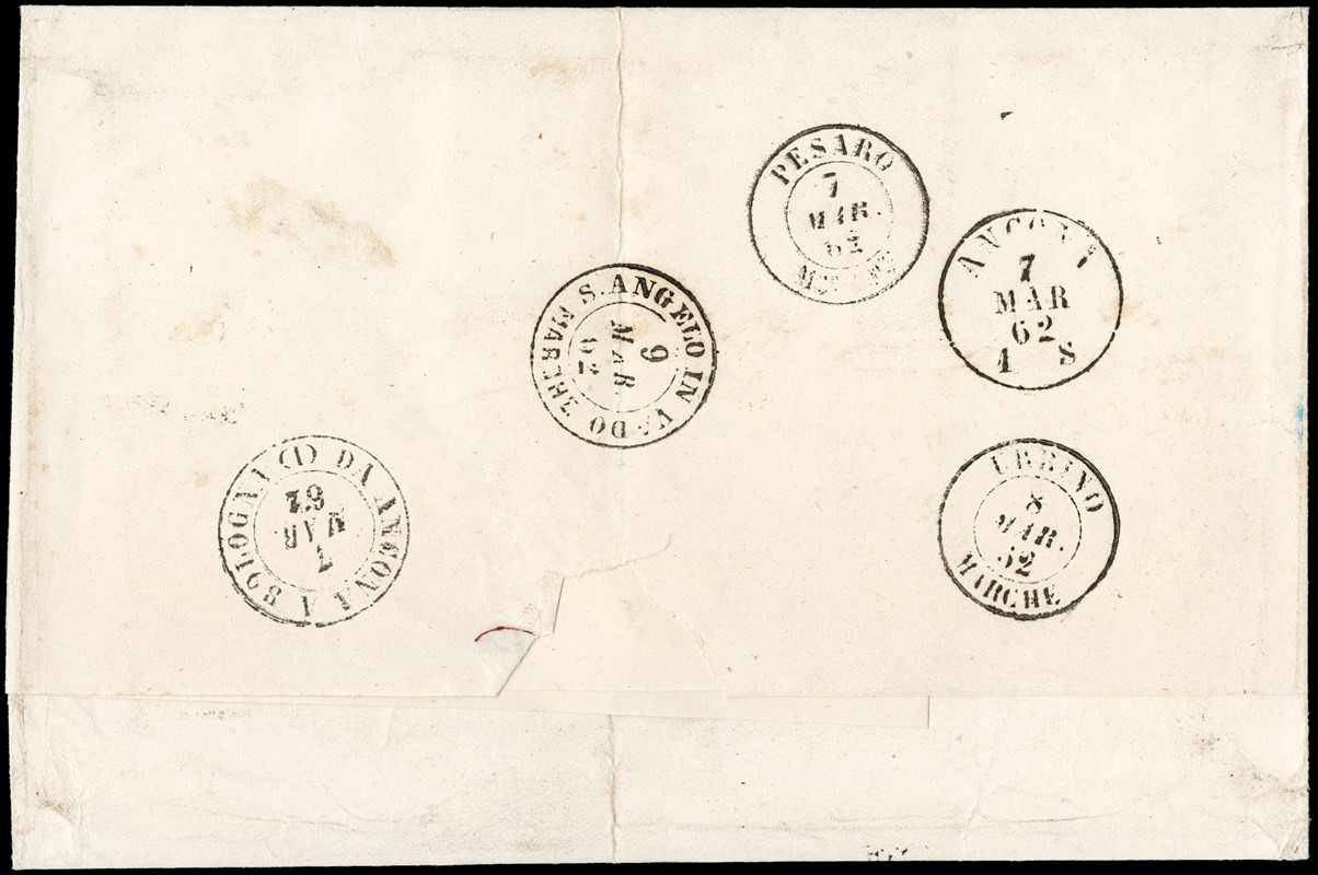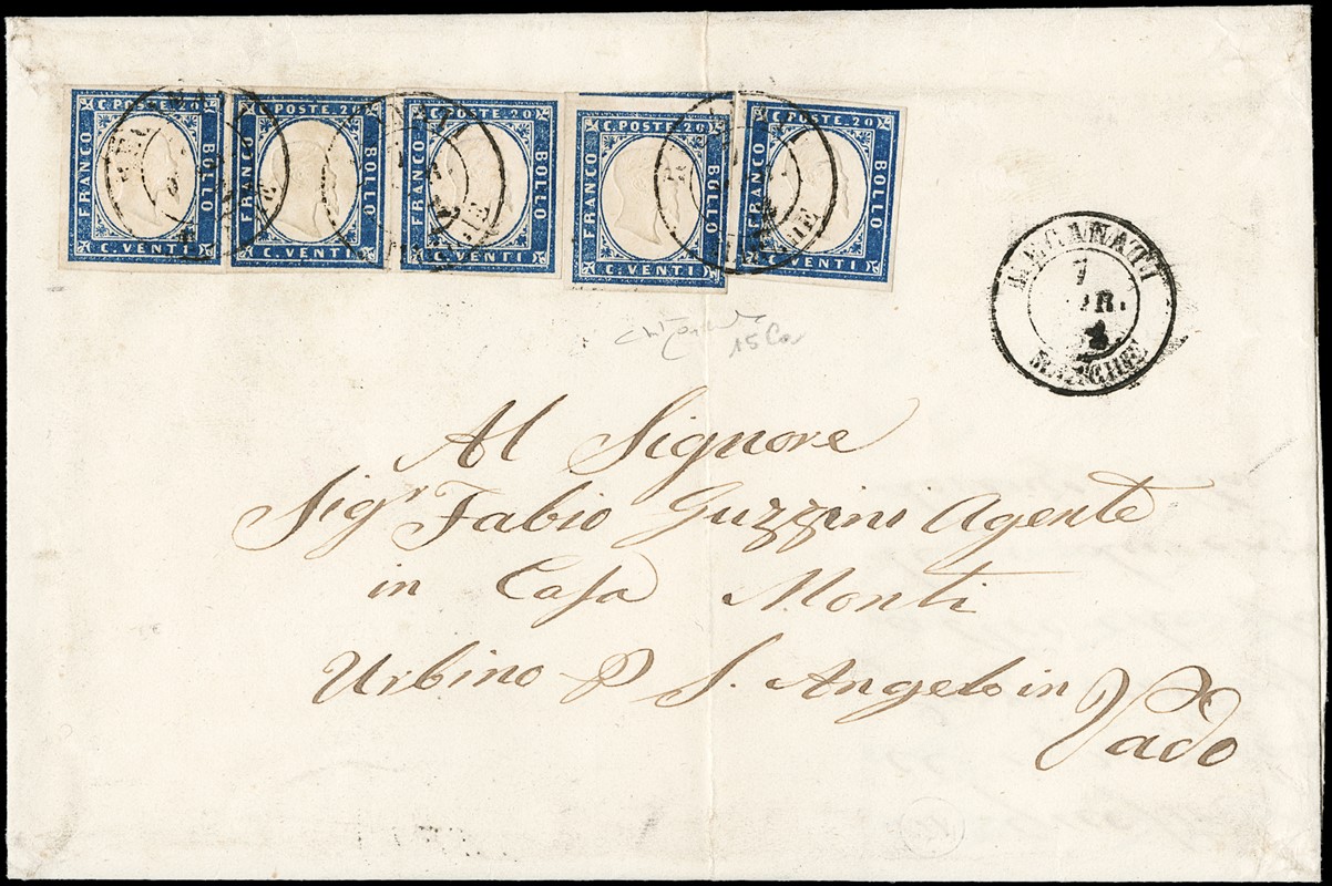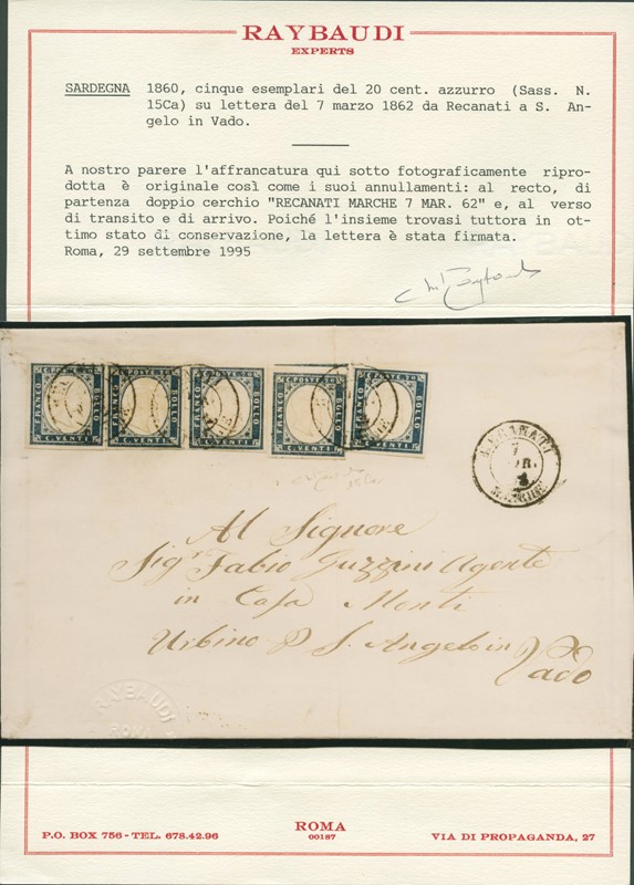 1855 - 20c azzurro, I tav. tir.60, cinque esemplari tutti ben marginati da 'RECANATI MARCHE 7 MAR. 62' a S. Angelo in Vado. Rara lettera con piega antecedente l'affrancatura, francobolli tutti perfetti. CF Raybaudi (Sassone 15Ca - Euro 45.000:2 = Euro 22.500)