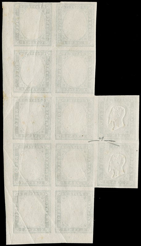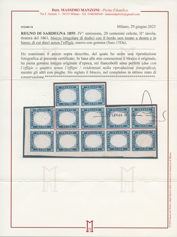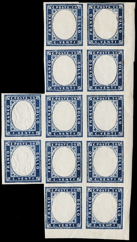 1855 - 20c celeste II tav, tir.61, blocco irregolare di 12, di cui 10 senza effigie, con bordo non tosato a destra e in basso, tutti SL. Sei francobolli perfetti tra cui i due con l'effigie. Molto raro. CF Manzoni (Sassone 15Da - Euro 14.250++ per i sei perfetti)