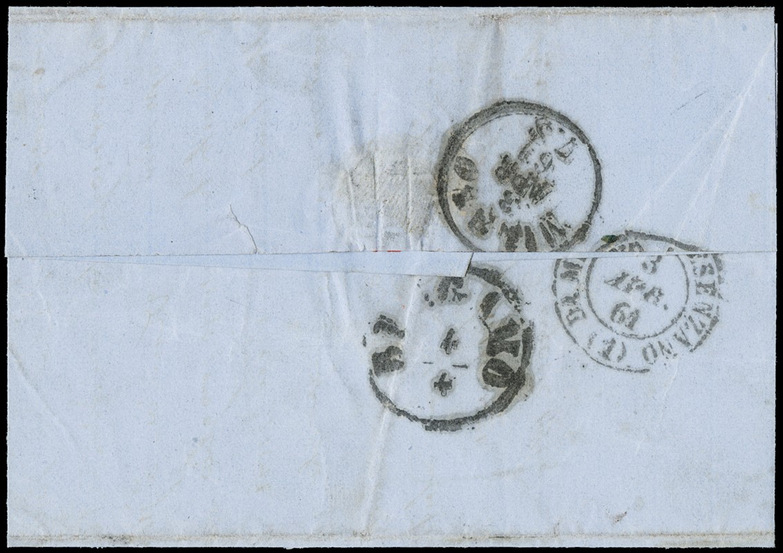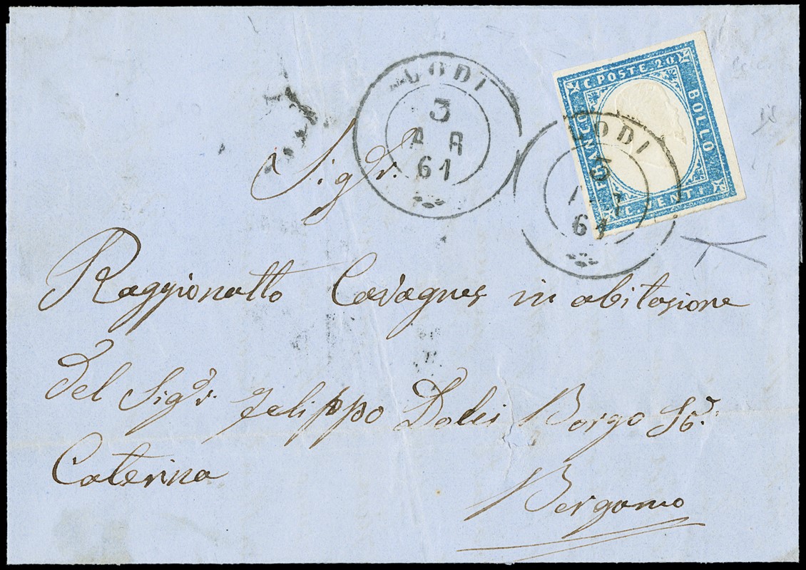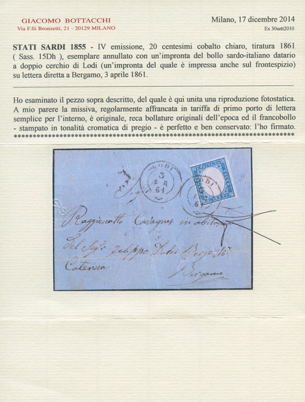 1855 - 20c cobalto chiaro tir.61, da 'LODI 3 APR 61' a Bergamo. Firma Fiecchi e CF Bottacchi (Sassone 15Dh - Euro 30.000)