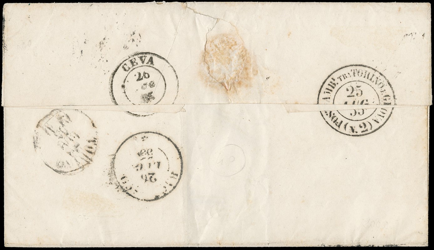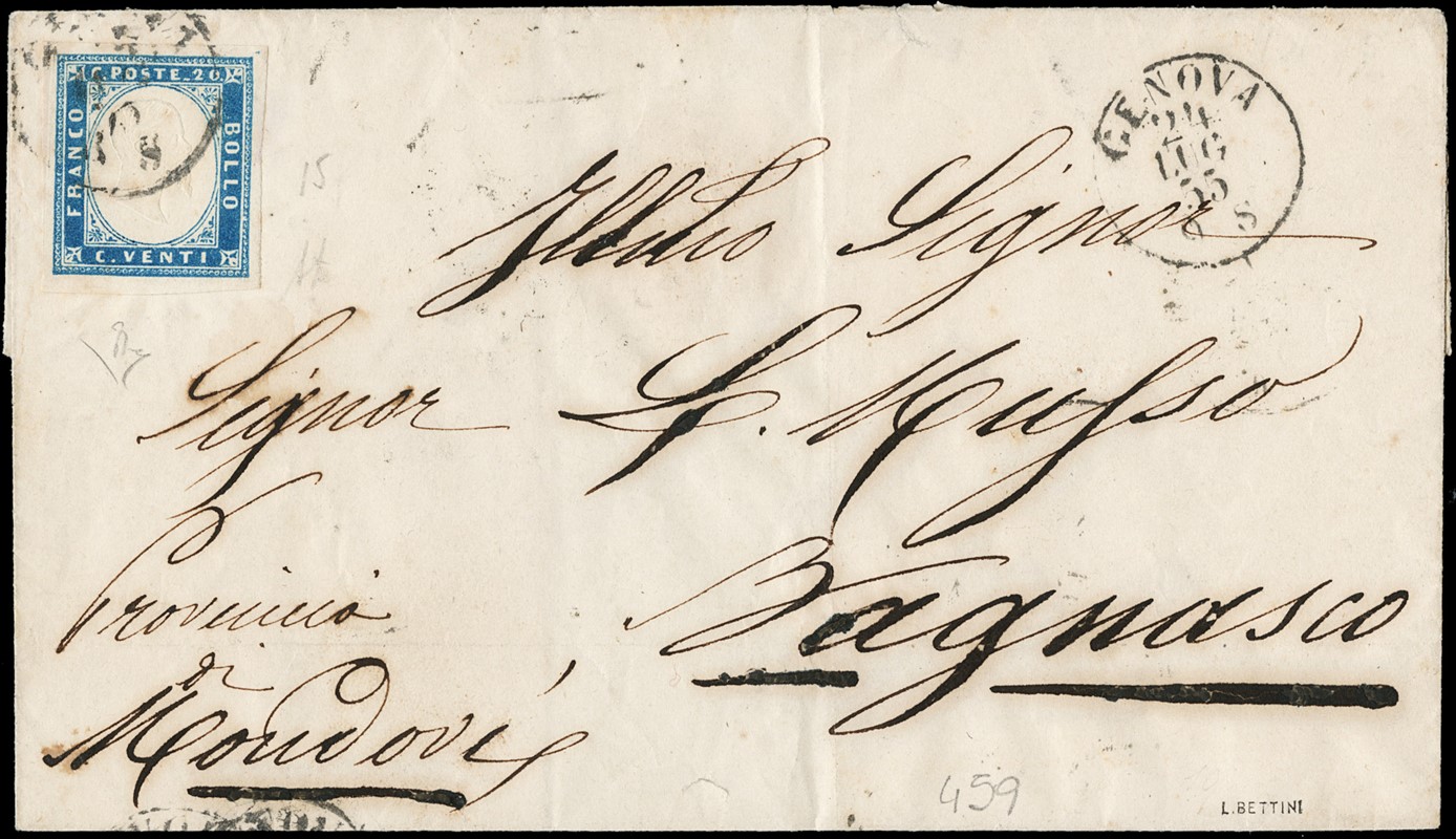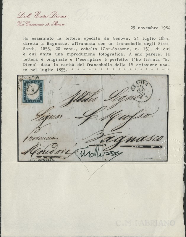1855 - 20c cobalto I tavola, tir.55, da “GENOVA 24 LUG 55' a Bagnasco. Raro uso nel primo mese di validita' della IV emissione, splendida. Sigla A.Diena, CF E.Diena (Sassone 15 - Euro 37.500)