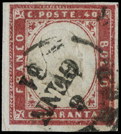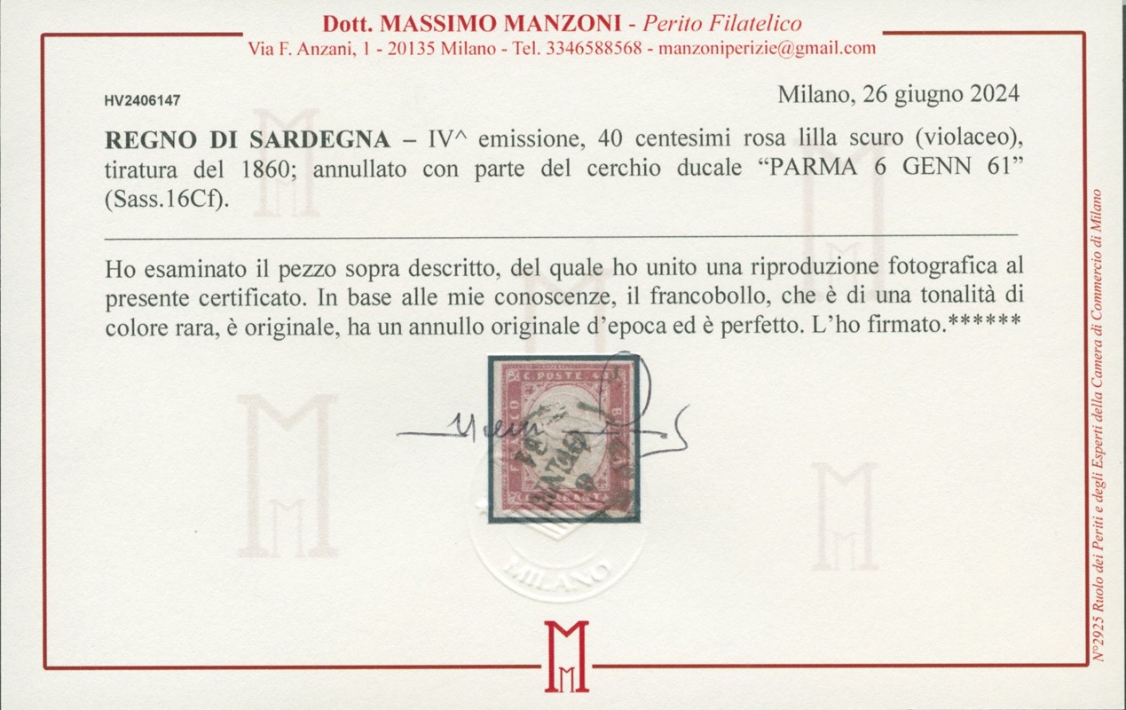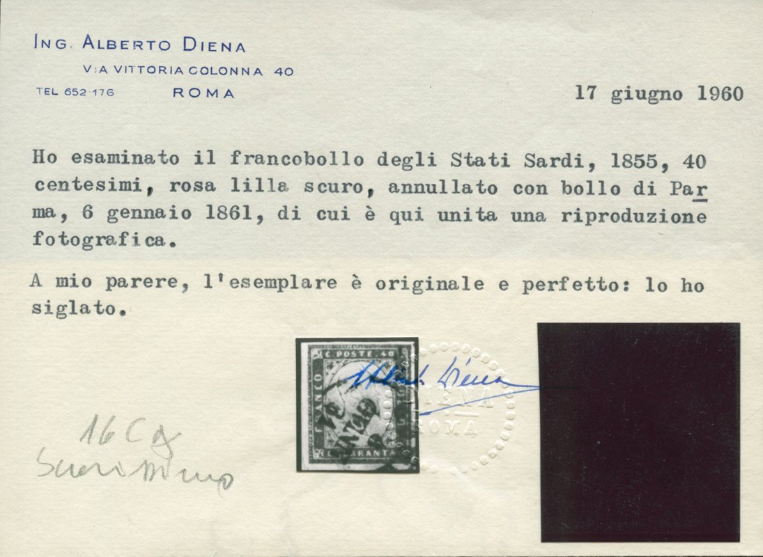1855 - 40c rosa lilla scuro (violaceo), tir.'60, usato a Parma. Tinta rarissima, firma Em.Diena, CF A.Diena e Manzoni (Sassone 16Cf - Euro 35.000)